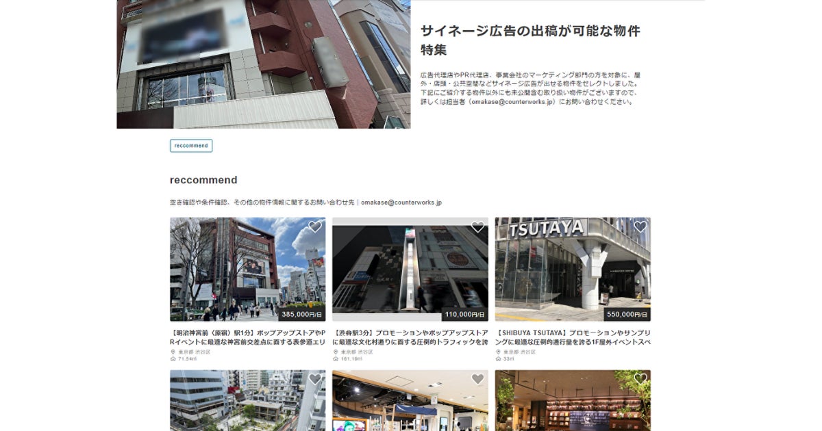 株式会社COUNTER WORKS(東京都目黒区、代表取締役CEO:三瓶直樹)運営するポップアップストアや催事などの出店場所探しのプラットフォーム「SHOPCOUNTER(ショップカウンター)」は、広告代理店やPR代理店、事業会社のマーケティング部門の方を対象に、屋外・店頭・公共空間などデジタルサイネージ広告が出せる物件をセレクトした特集を開始しました。