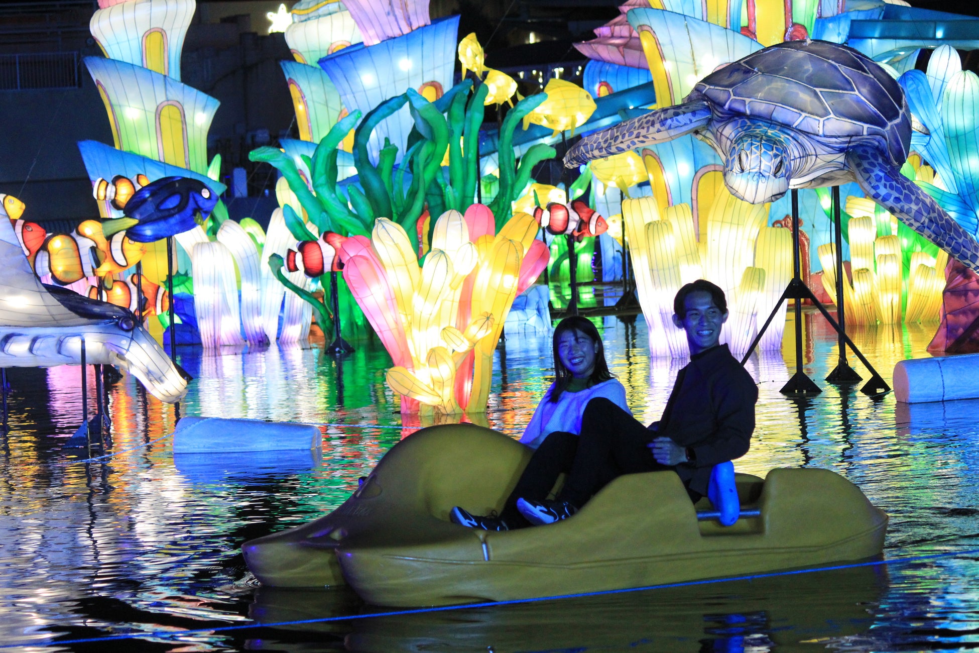 「海」のエリアでは海から生まれたサンゴや魚、ウミガメたちが来場者を出迎える「ランタンストリート」がプールエリアを彩ります。ランタンオブジェの魚たちと記念撮影をお楽しみいただけます。