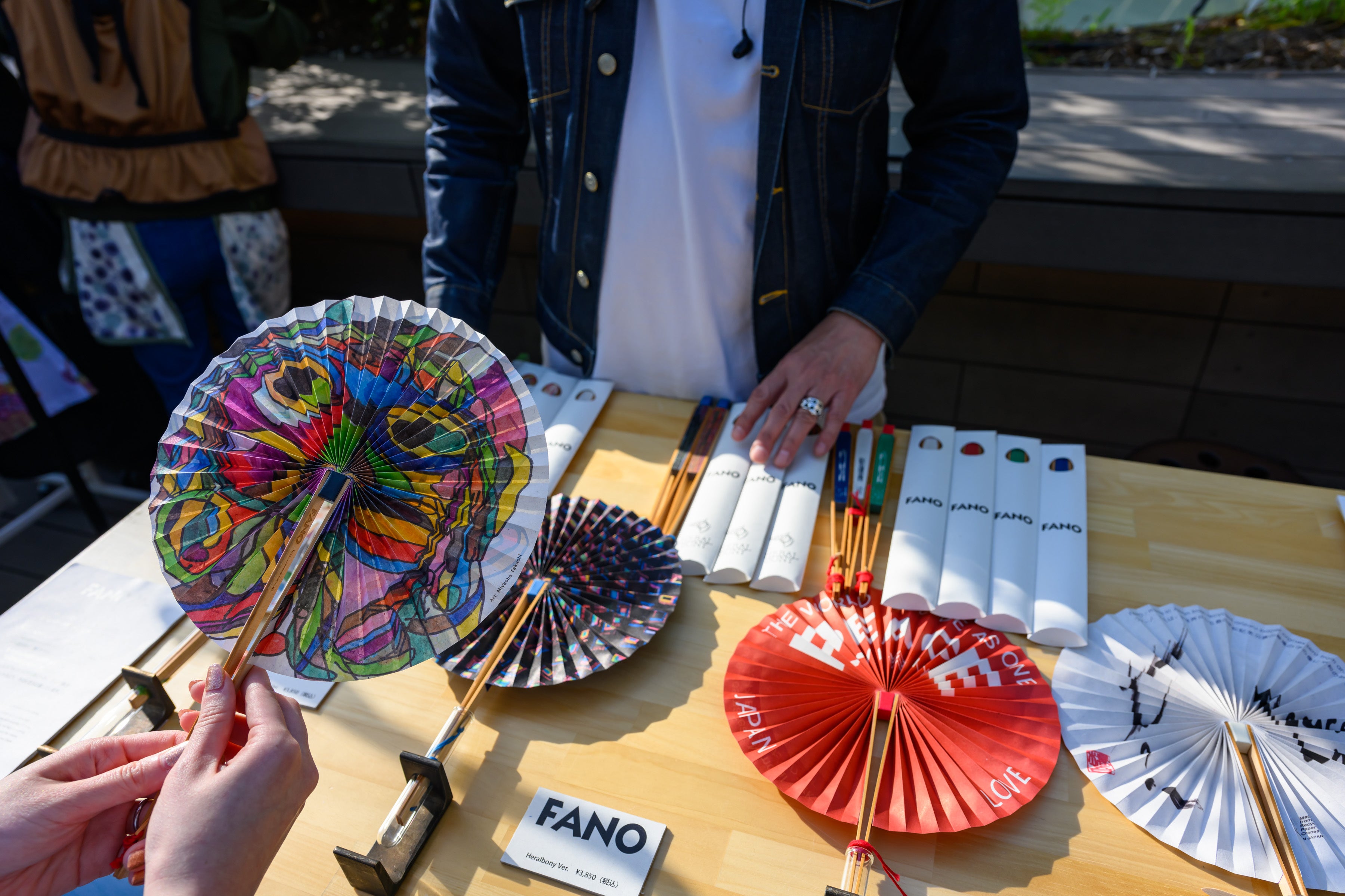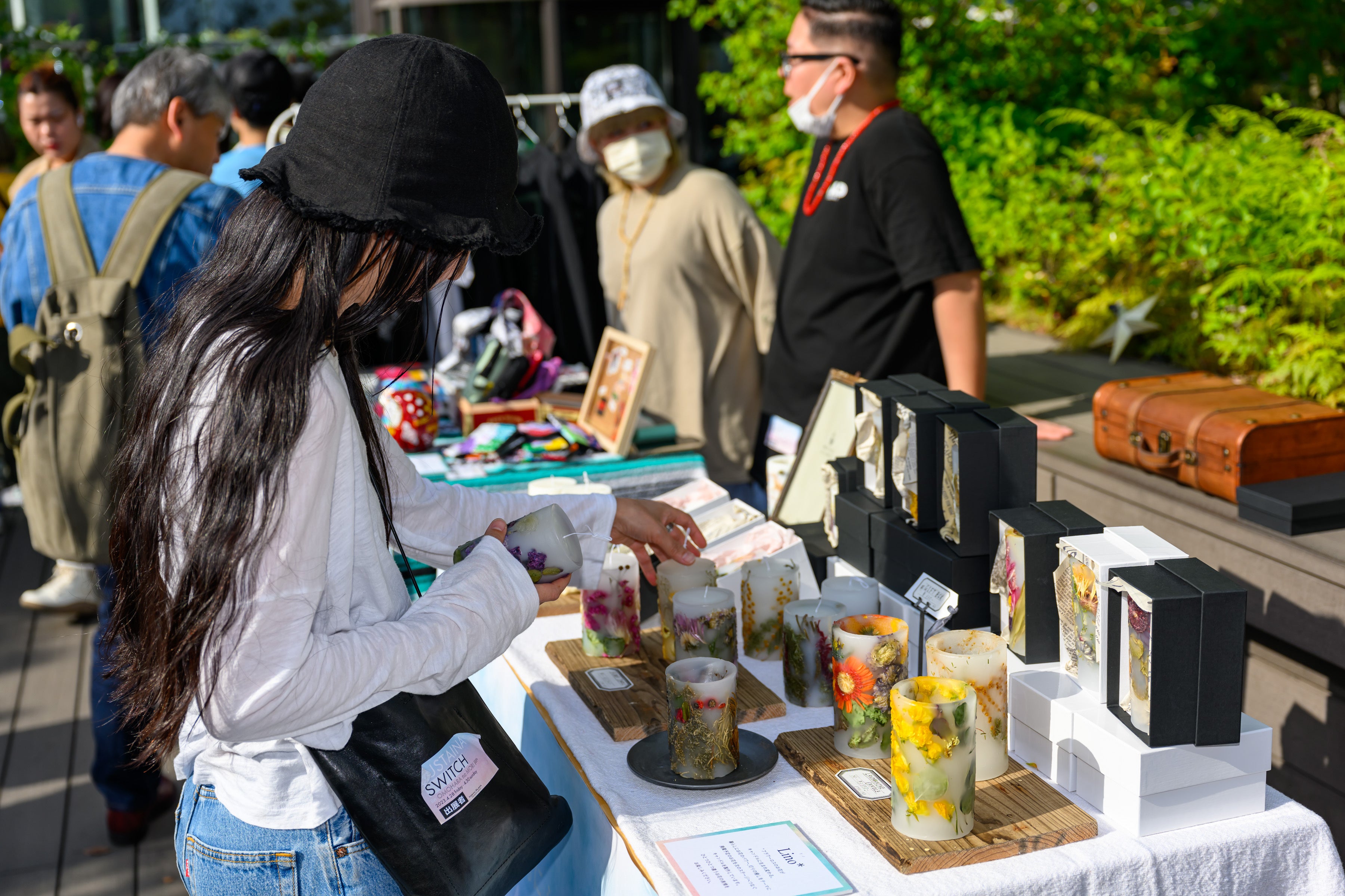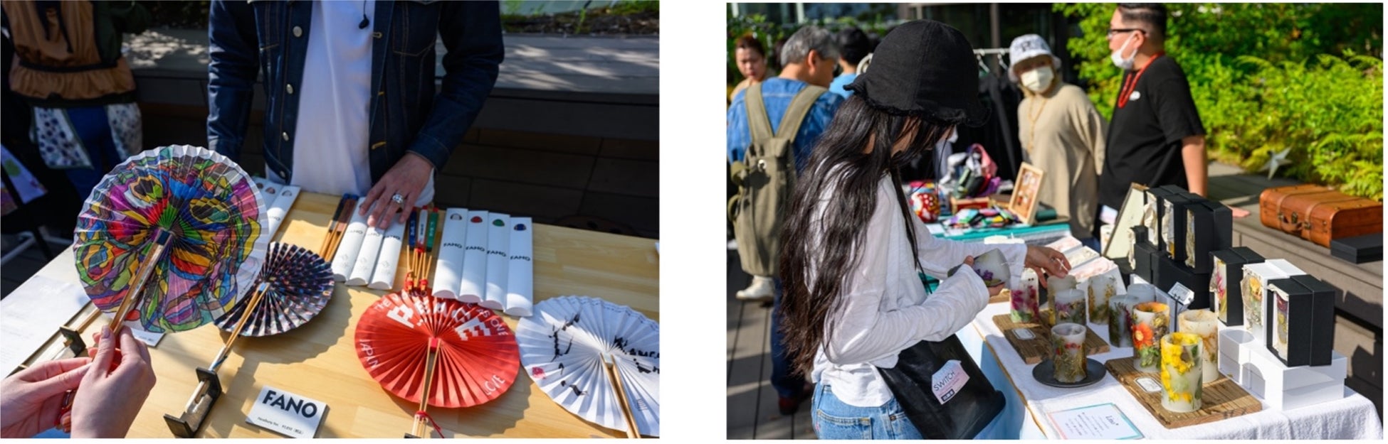 そのほか、廃材を利用したアクセサリーや雑貨を販売する「青空個展presents サステナブルマーケット」を実施。都内近郊で定期的に開催されるてづくり市「青空個展」で、サステナブルな商品を展開しているアーティスト各日7名が出店し、着物の帯をリメイクしたポーチや廃棄予定のロスフラワーを使用したキャンドル、広島に贈られた折り鶴の再生紙で出来た扇子など、リサイクル可能な材料を利用した雑貨やアクセサリーを販売しました。出展者紹介パネルをご覧になったり、商品の制作過程にじっくりと耳を傾ける方も多く、SDGsに興味のある若い世代が多く見受けられました。