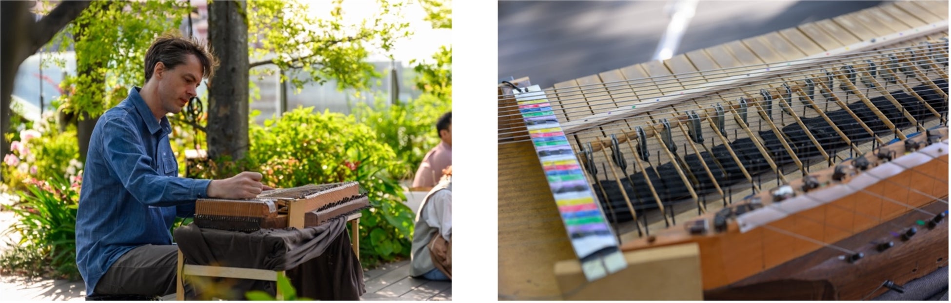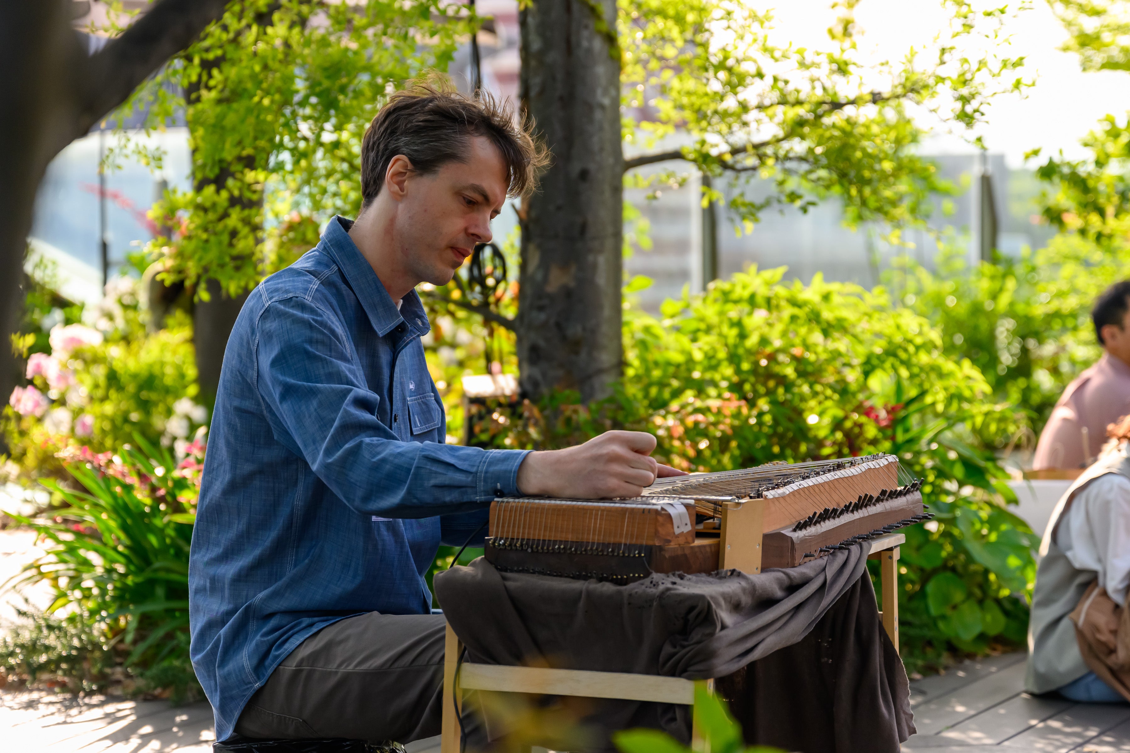 心地よい音色をBGMに、幅広い世代・国籍の方々が、ゆったりと思い思いの時間を過ごしていました。アーティスト自作の楽器にも興味を持つ方が多く、演奏中の動画撮影や演奏終了後に楽器の仕組みを尋ねるなどの場面もありました。