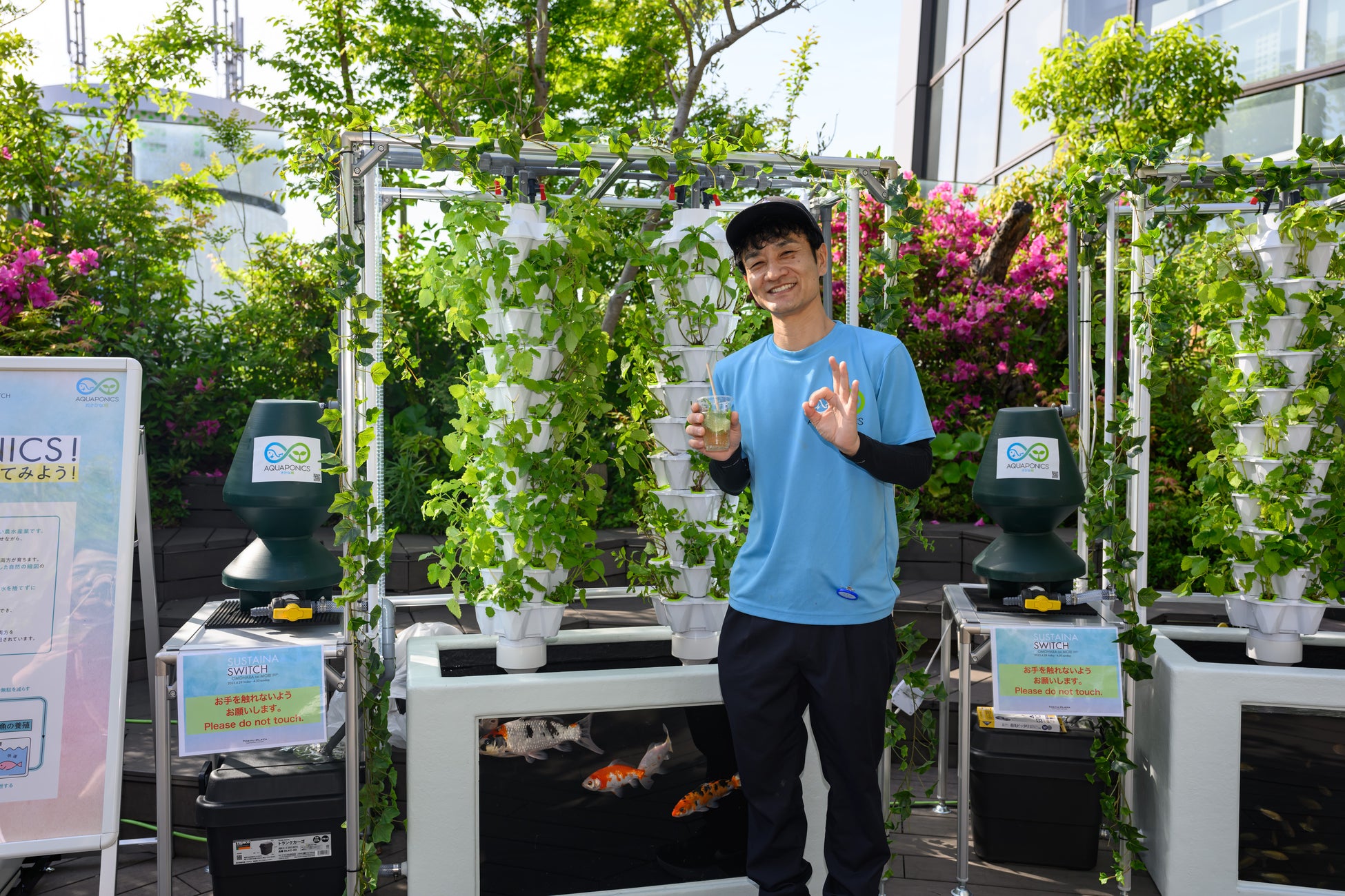 「アクアポニックス」のブースでは、水耕回転タワーの展示と収穫できる食材の試飲体験を通じて、都心にいながらできる新しい農業のかたちを発信。ご来場いただいたお客様には、アクアポニックスの「おさかな畑」で育ったレモンバームとスペアミントのハーブ2種の収穫と、そのハーブを使用したドリンクの試飲を体験いただきました。特に20代〜30代前半の方や海外の方がアクアポニックスに興味を持ち、循環の仕組みについてスタッフの説明を熱心に聞く場面が多く見られました。