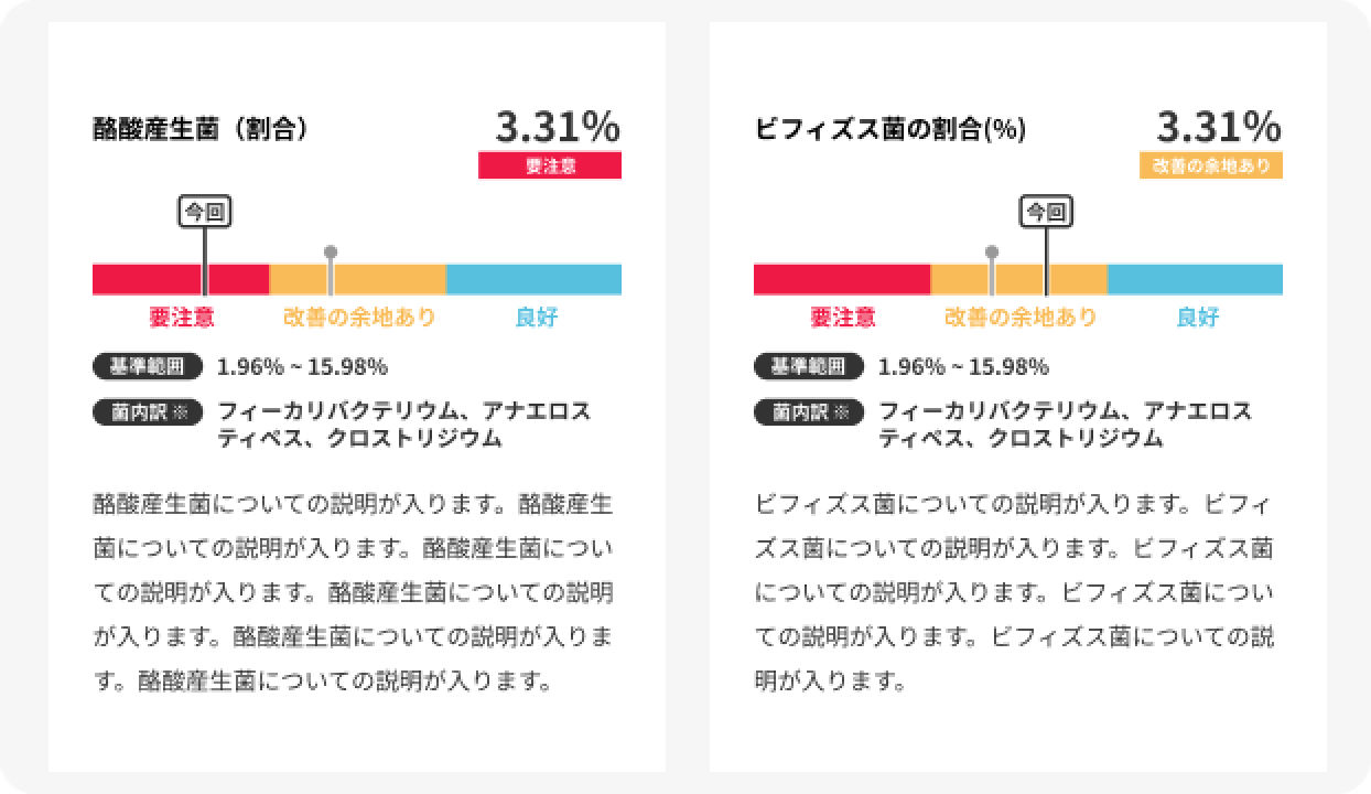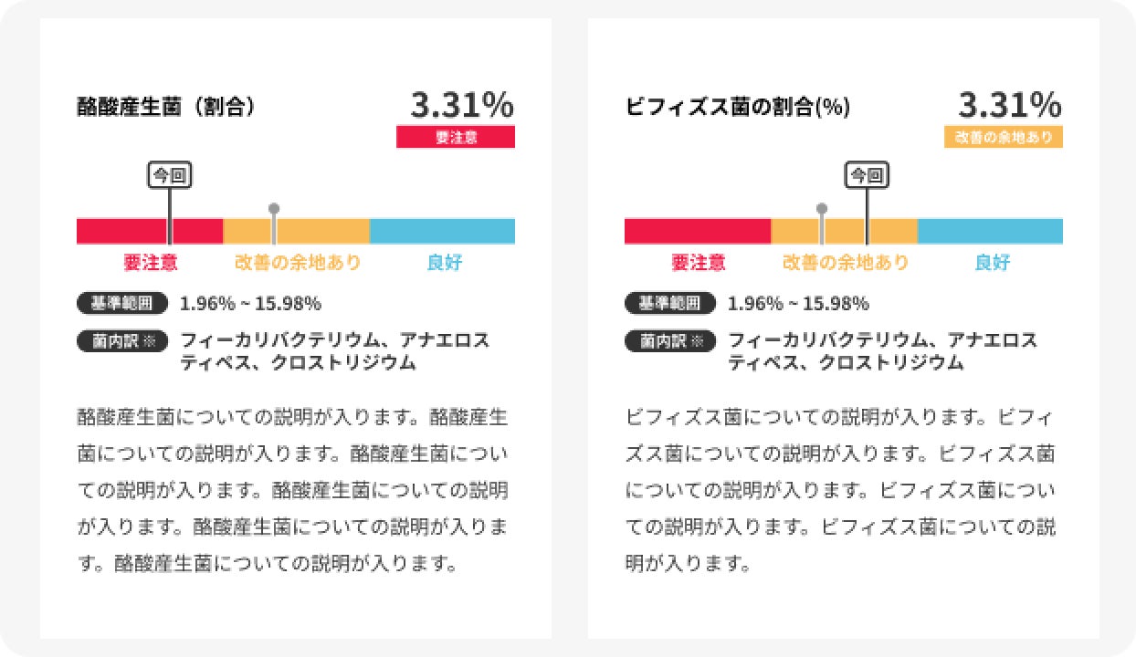 アレルギーなどの免疫機能の調整が期待される酪酸産生菌とビフィズス菌の保有割合が分かります。これらの菌は、肥満の防止や代謝促進など、有用菌として注目されています。