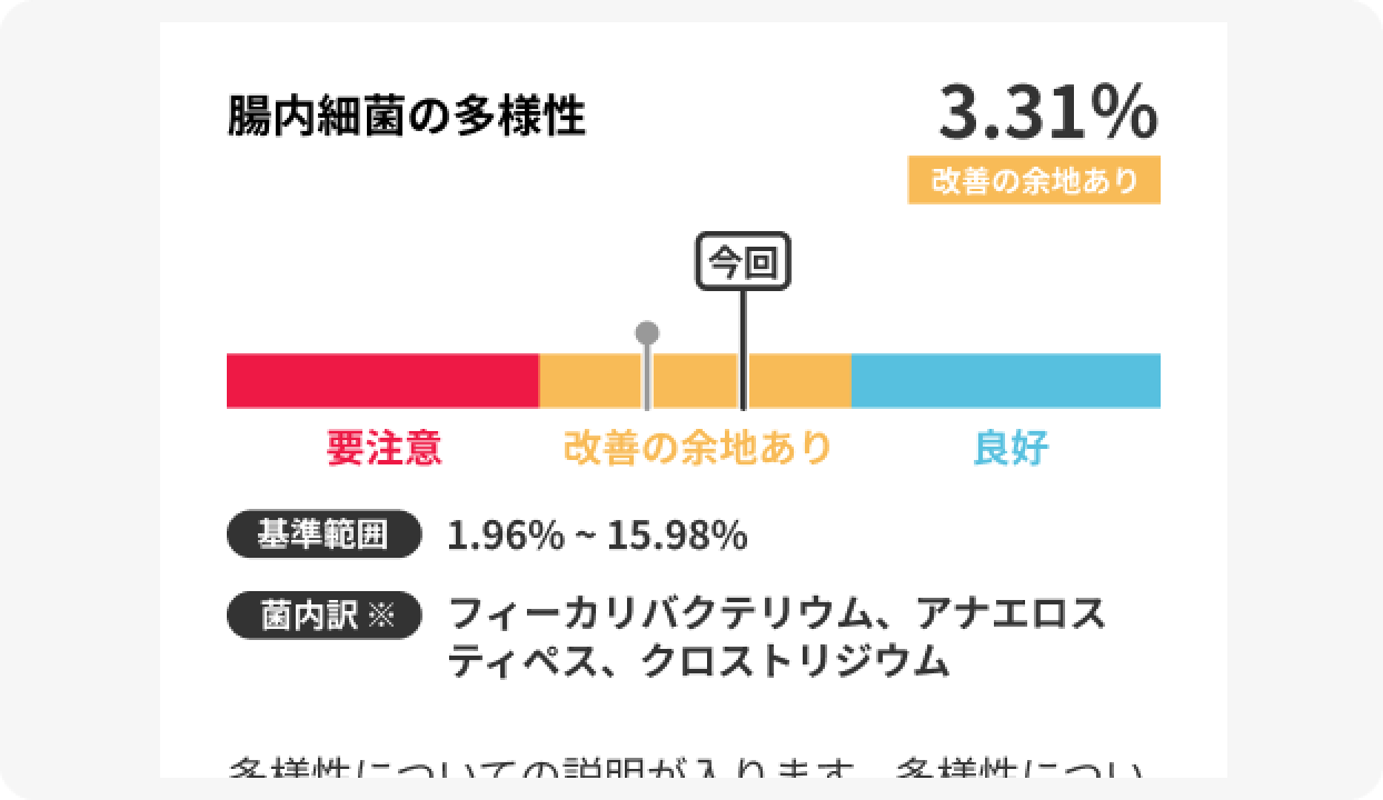 良好な腸内環境の指標となる腸内細菌の多様性が分かります。多様性が高いほど腸内環境が理想的であり、多様性が低いと様々な疾患リスクとの関連があるとされています。
