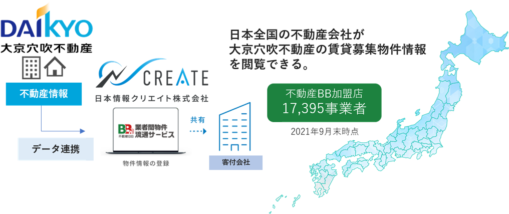 日本情報クリエイトが提供する業者間物件流通サービス「不動産BB」は不動産会社同士がオンライン上で不動産情報を共有できるクラウドサービスであり、これまで電話・FAXで連絡を取り合っていた業務をデジタル化することにより、不動産会社の業務生産性向上に貢献しております。日本全国の不動産会社に利用いただいており、その導入事業者数は17,000を超えております。大京穴吹不動産は、これまで直営店舗を日本全国に展開(32都道府県に75店舗展開[賃貸専門1拠点含む]。2021年10月現在)し、不動産売買・賃貸運営を希望される国内の多くのお客様と接点を持ってまいりました。日本全国に広がる店舗ネットワークによる確かな情報力を生かして、マンション・戸建・土地はもちろんのこと、ビルや商業施設・アパートなどのすべての不動産売買・賃貸に関わる”総合不動産流通事業”を展開しております。