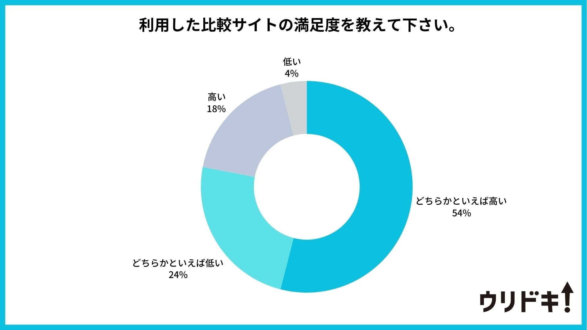 利用した比較サイトの満足度に関して、「どちらかといえば高い」という意見が最も多く、次いで「どちらかといえば低い」「高い」の順に多く挙げられました。