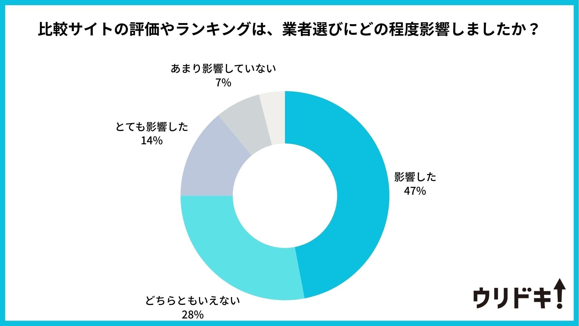 また、比較サイトの評価やランキングが業者選びにどの程度影響したかについて、「影響した」という回答が最も多く挙げられ、次いで「どちらともいえない」「とても影響した」の順に多く挙げられました。