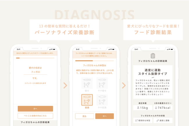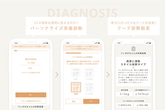 わずか1分、愛犬の体重・体型・運動量、アレルギーなど10個の質問に回答するだけで最適な摂取カロリー量やメニューのフードプランを提案。パックごとに愛犬のお名前を貼って、ごはんが切れる前にご自宅にお届けします。