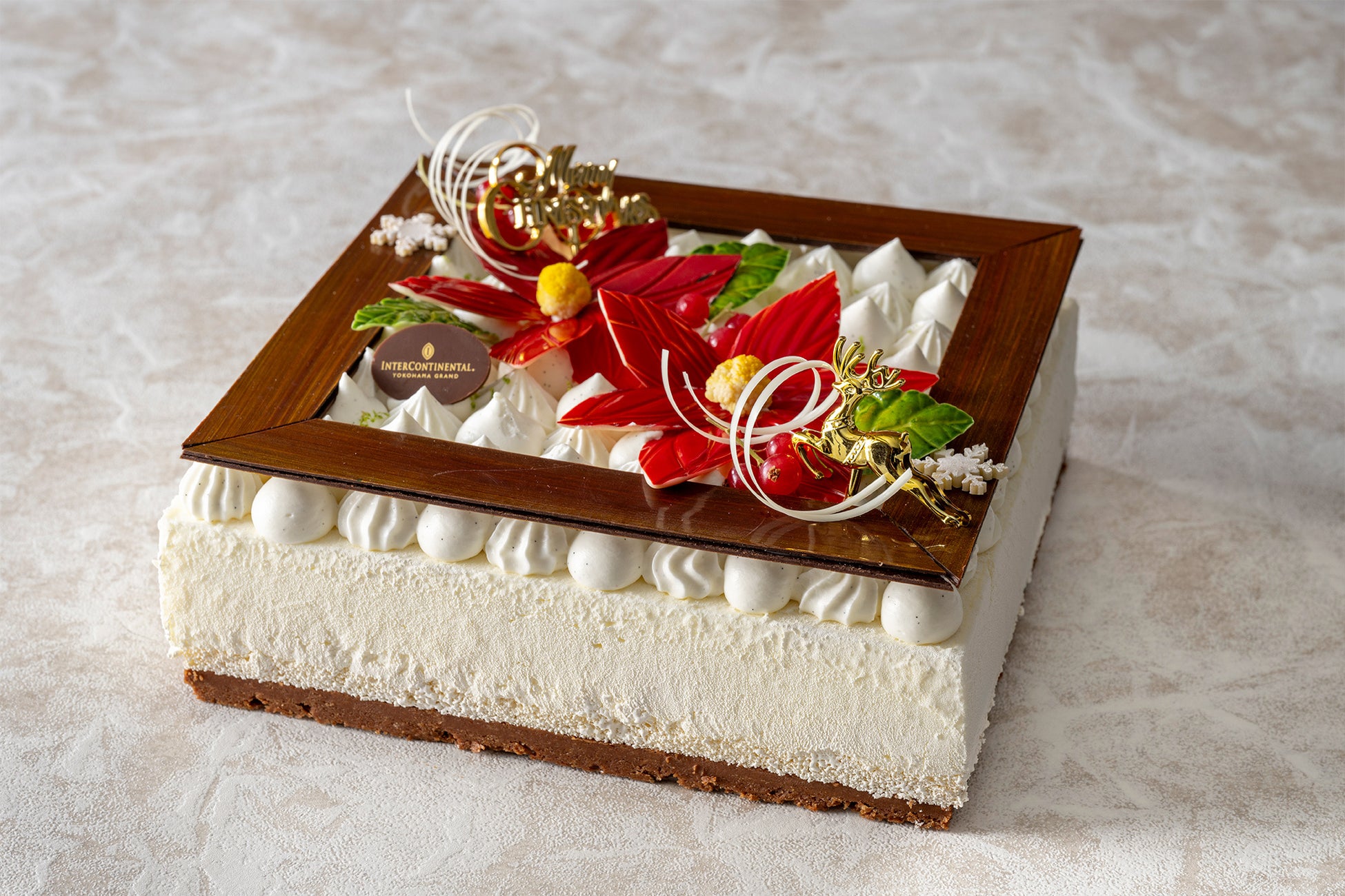 白いクリームに深紅のポインセチアが映える、印象的なスクエアのケーキ。爽やかなチーズのムースと甘酸っぱいカシスジュレを濃厚なホワイトチョコレートムースで挟み、トップにバニラガナッシュをたっぷりと絞りました。6~8名様でお召し上がりいただけるサイズなので、ご家族ではもちろんのこと、パーティーなどにもおすすめです。