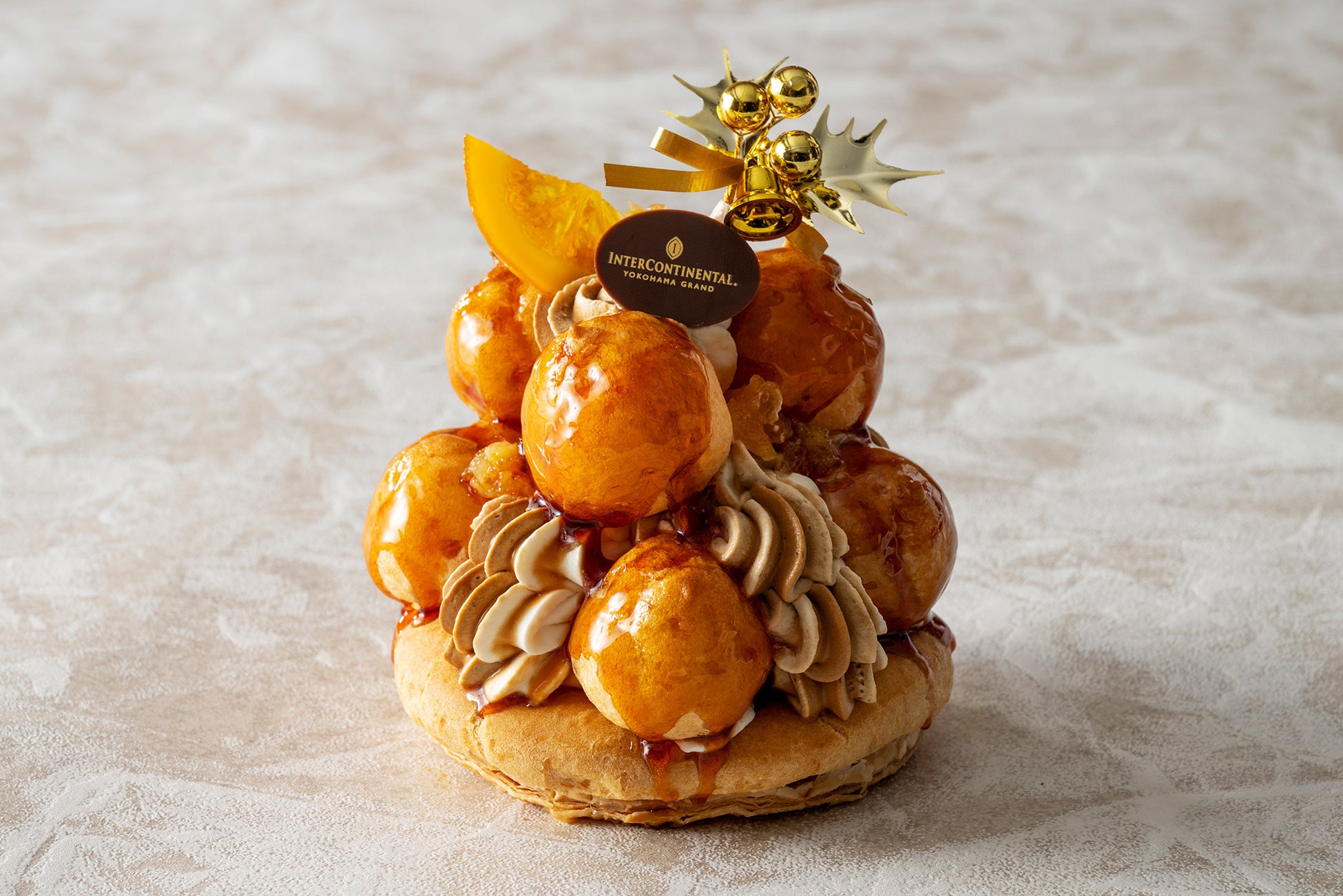 特別な日に供されるフランスの伝統的な菓子、クロカンブッシュを当ホテル風にアレンジしました。サクサクとしたパイ生地に、中央に濃厚な味わいのキャラメルブリュレとクレームオランジュを忍ばせた香り高いオレンジムースをのせ、プチシューとキャラメル味のクリームでツリー状に仕立てました。シュー表面のパリパリとした飴の食感も楽しい大人のクリスマスケーキです。