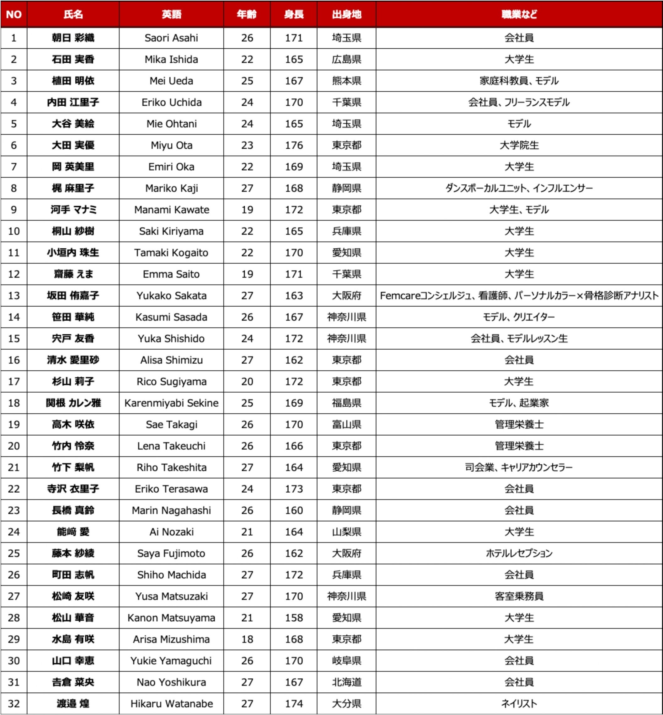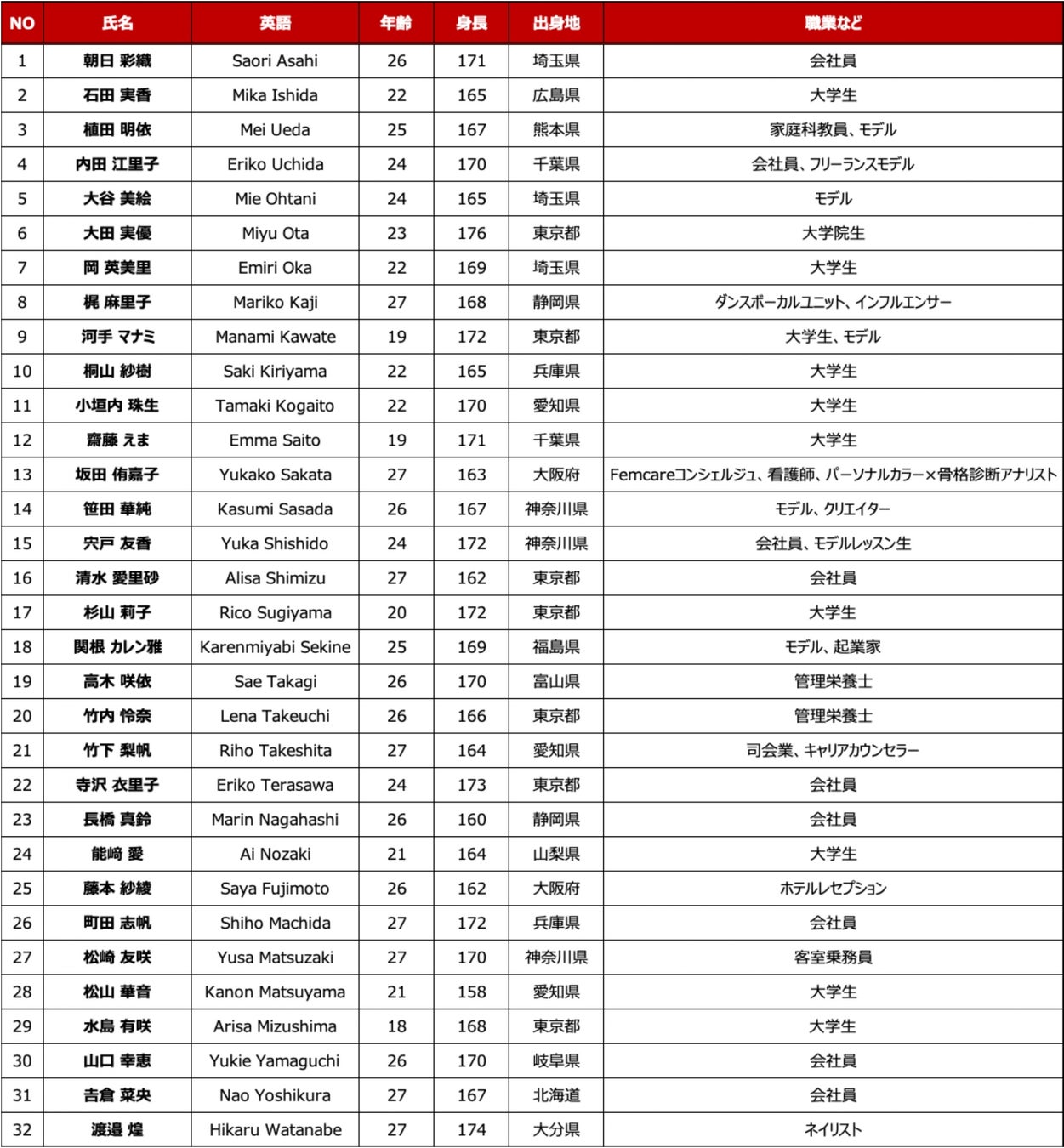 32名のファイナリストは、東京や神奈川などの関東圏から北は北海道、南は熊本まで、職業も会社員や学生をはじめ、管理栄養士や客室乗務員、看護師などとバックグラウンドもさまざまです。