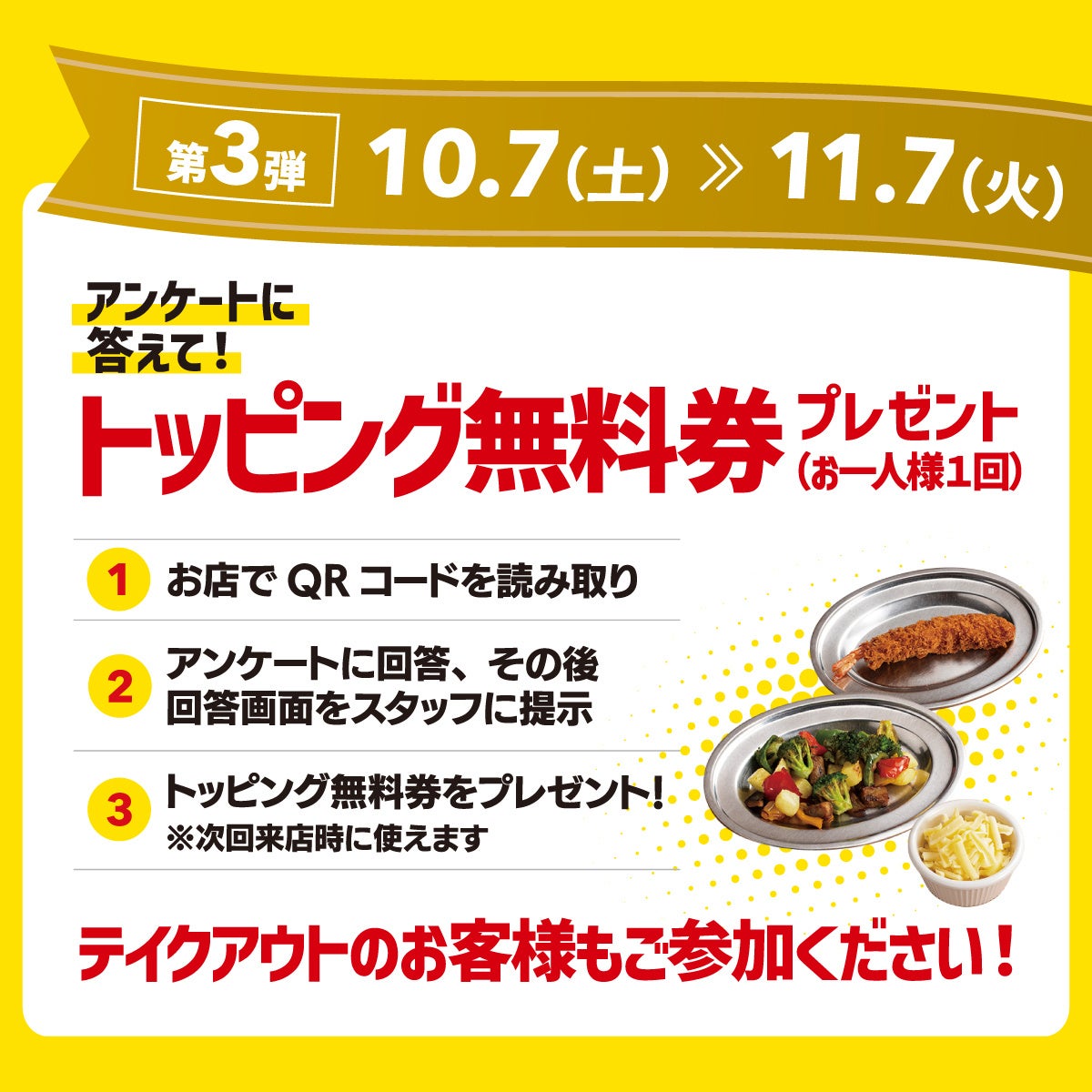 〇内容:お店でアンケートQRコードを読み取り、アンケートに回答。最後の画面をスタッフに見せて頂いた方に、次回使える「トッピング無料券」(カレーをご注文の際に利用可能)をプレゼントします。