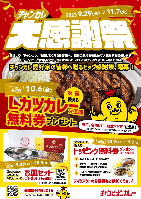 株式会社チャンピオンカレー(本社:石川県野々市市、代表取締役:南 恵太)は、お客様の日頃のご愛顧に感謝の気持ちを込めて、「チャンカレ大感謝祭」を2023年9月29日(金)~11月7日(火)まで実施いたします。期間中は店内にて1皿食べたら「Lカツカレー無料券」プレゼントや、X(Twitter)キャンペーン、トッピング無料券プレゼント企画など、ドドーンと3つのお得なキャンペーンを企画しました!ぜひお楽しみください。
