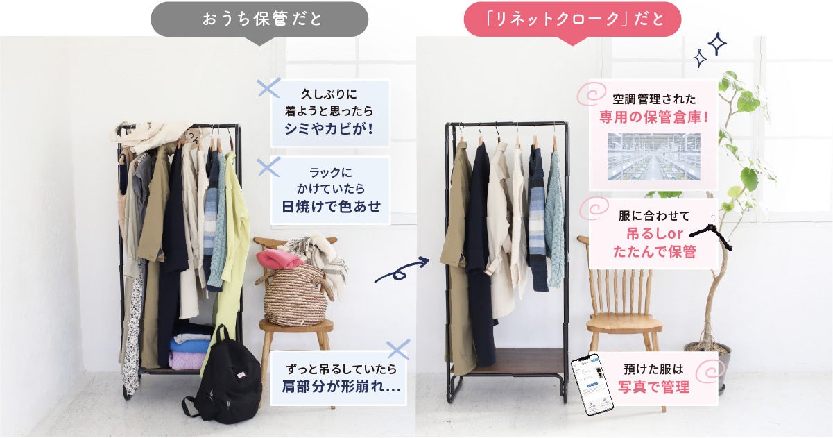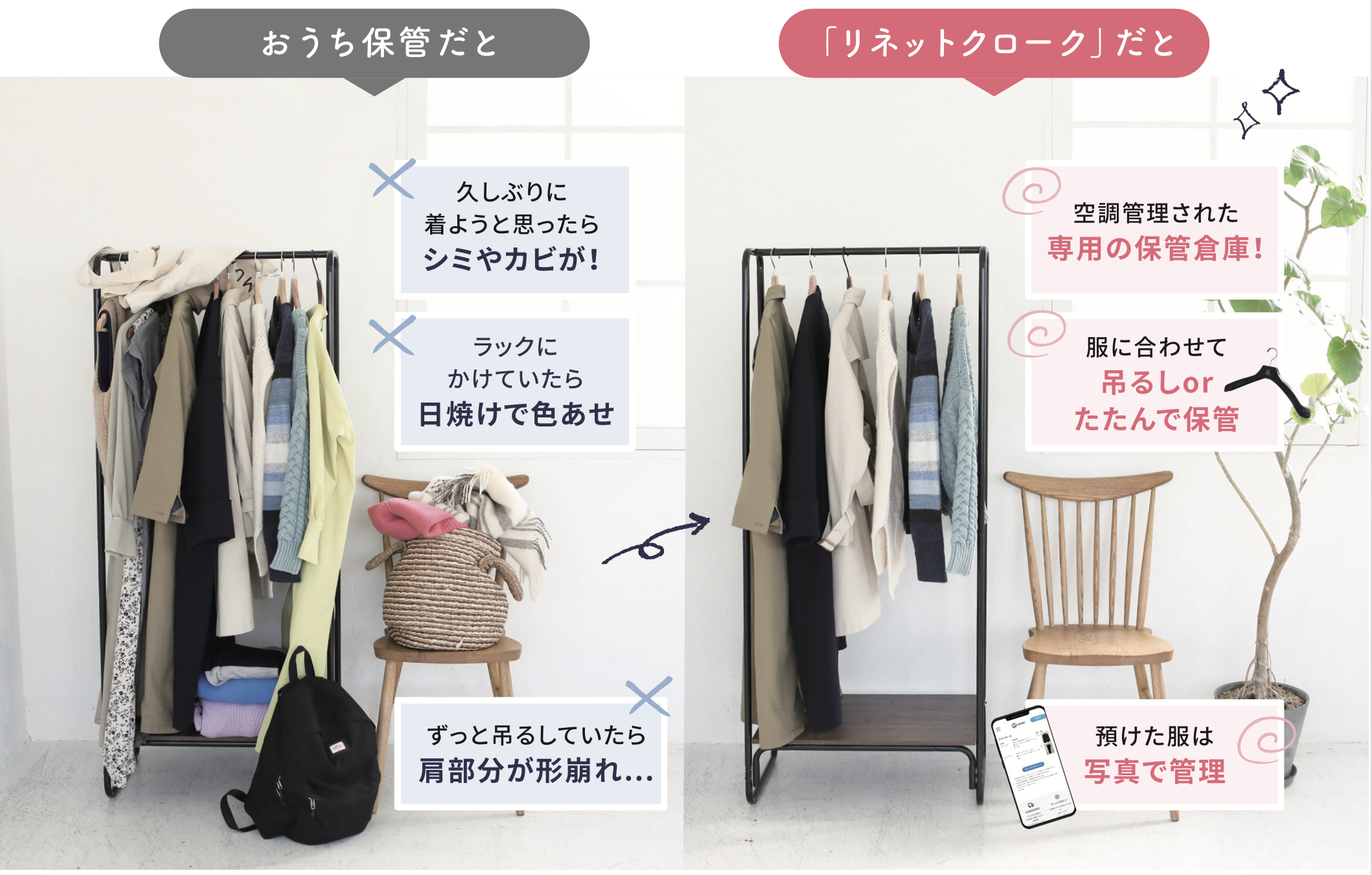 コロナ禍でおうち時間が増え、すっきり快適な暮らしを望む方が多く断捨離ニーズが高まっています。特にクローゼットは新しいお洋服を購入するたび、スペースがなくなり詰め込み過ぎてしまいがち。断捨離はしたいけど、お気に入りのお洋服を大切に取っておきたいといったニーズにお応えするため、クリーニングした後、そのまま保管し、一点からお好きなタイミングで取り出しができるサービス「リネットクローク」を開始いたします。
