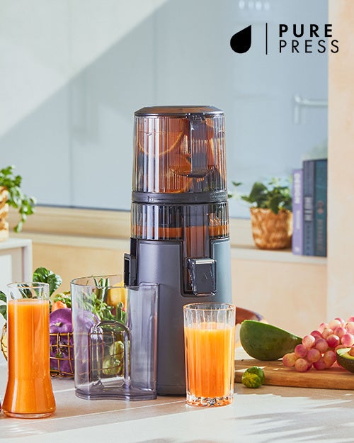 ヒューロムのコールドプレスジューサーは、独自技術の低速搾汁方式(スロースクイージング テクノロジー)で搾るため、熱に弱い酵素やビタミンを壊しにくく、素材本来の風味や栄養が詰まった生ジュースを作ることができます。