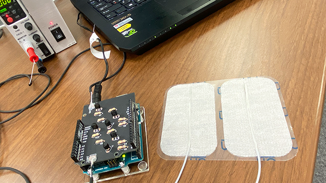 体験希望者は電極パットを腹部に貼り、4段階の電流の強さ(40%、60%、80%、100%)を順に体験。痛みに個人差があるため、無理のない範囲で各自が体験しました。