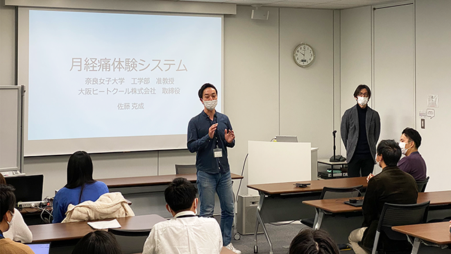 痛みを疑似体験するため任意参加としましたが、男性社員24名、女性社員5名が参加。冒頭、奈良女子大学の佐藤克成准教授より、生理痛を疑似体験できるVR装置「月経痛体験システム」についてご説明いただきました。