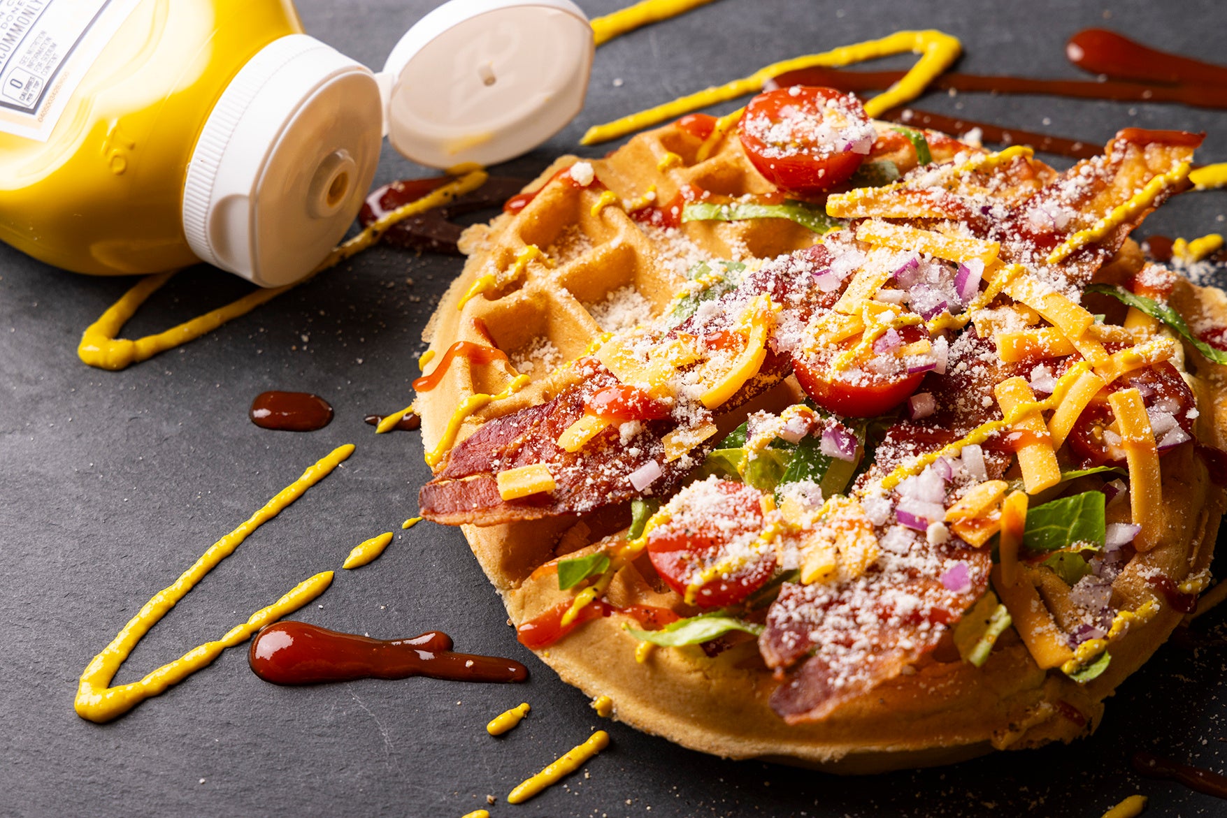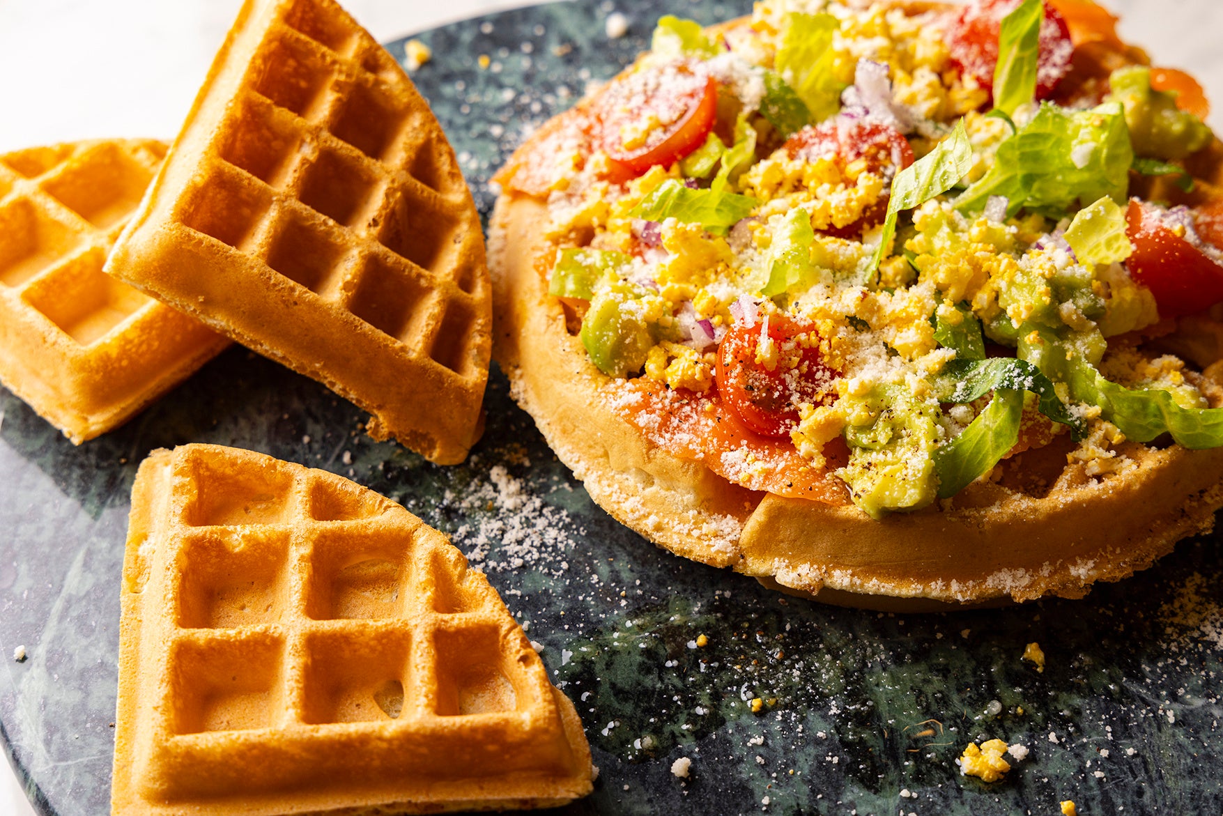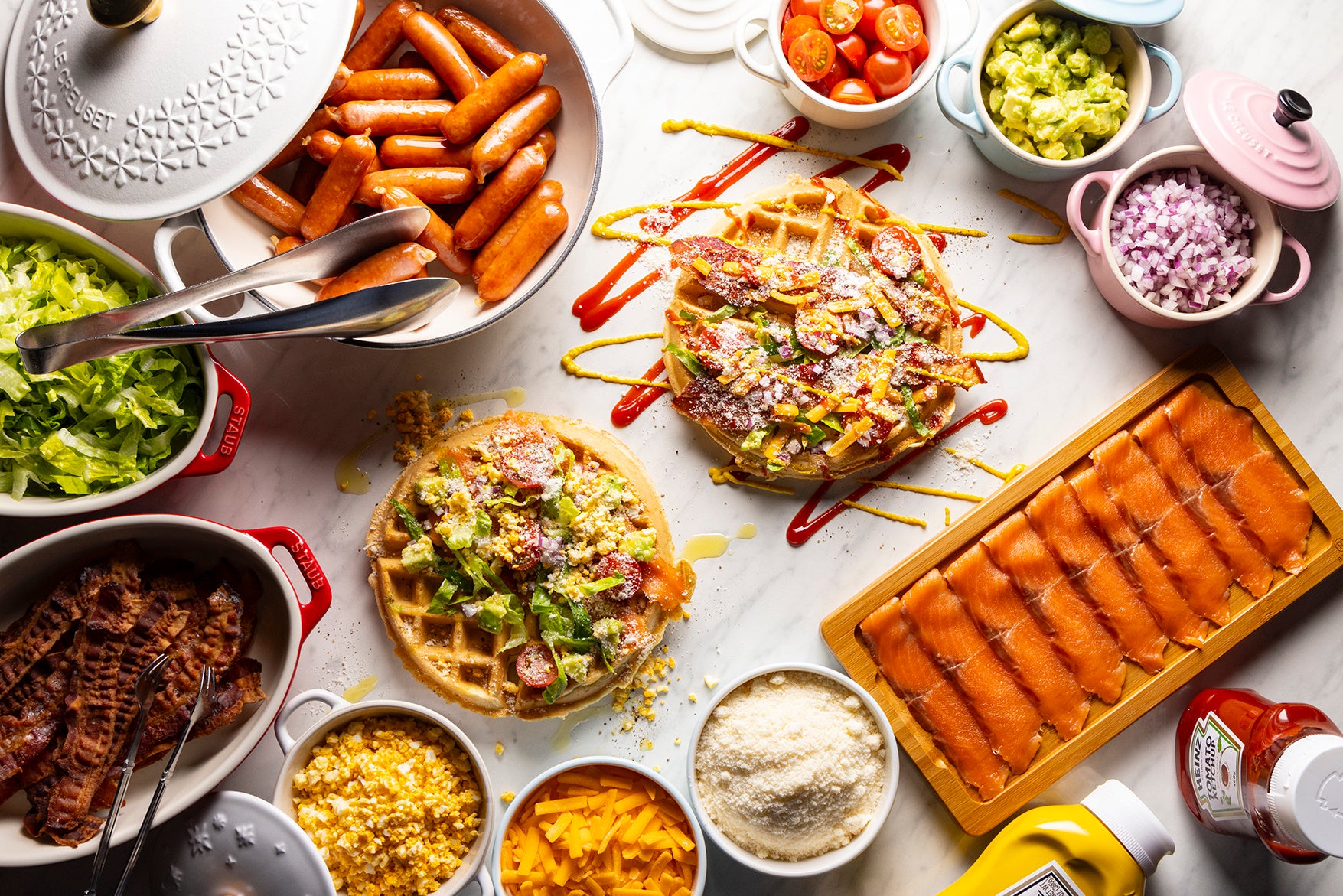 また、ビュッフェ台には、スモークサーモンやソーセージ、カリカリに焼いたベーコンのほか、野菜やレリッシュなど、充実のお食事トッピングがずらりと並びます。スモークサーモンやクリスピーベーコンをメインに、チーズ、新鮮野菜やアボカドなどをトッピングし、仕上げにオリーブオイルやブラックペッパーでアクセントをプラスすると、美味しさがワンランクアップ。さらに、ワッフルを丸いまま豪快に盛り付ける王道の楽しみ方はもちろん、小さく割ったひとつひとつに異なる具材を乗せたり、はさんだりなど、お好きな組み合わせで幾通りものアレンジと味わいは無限大に広がります。