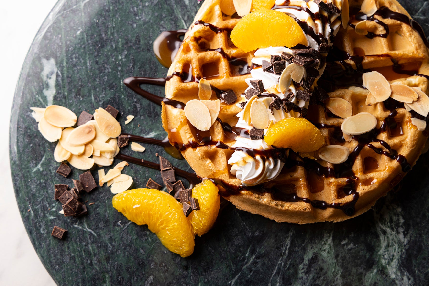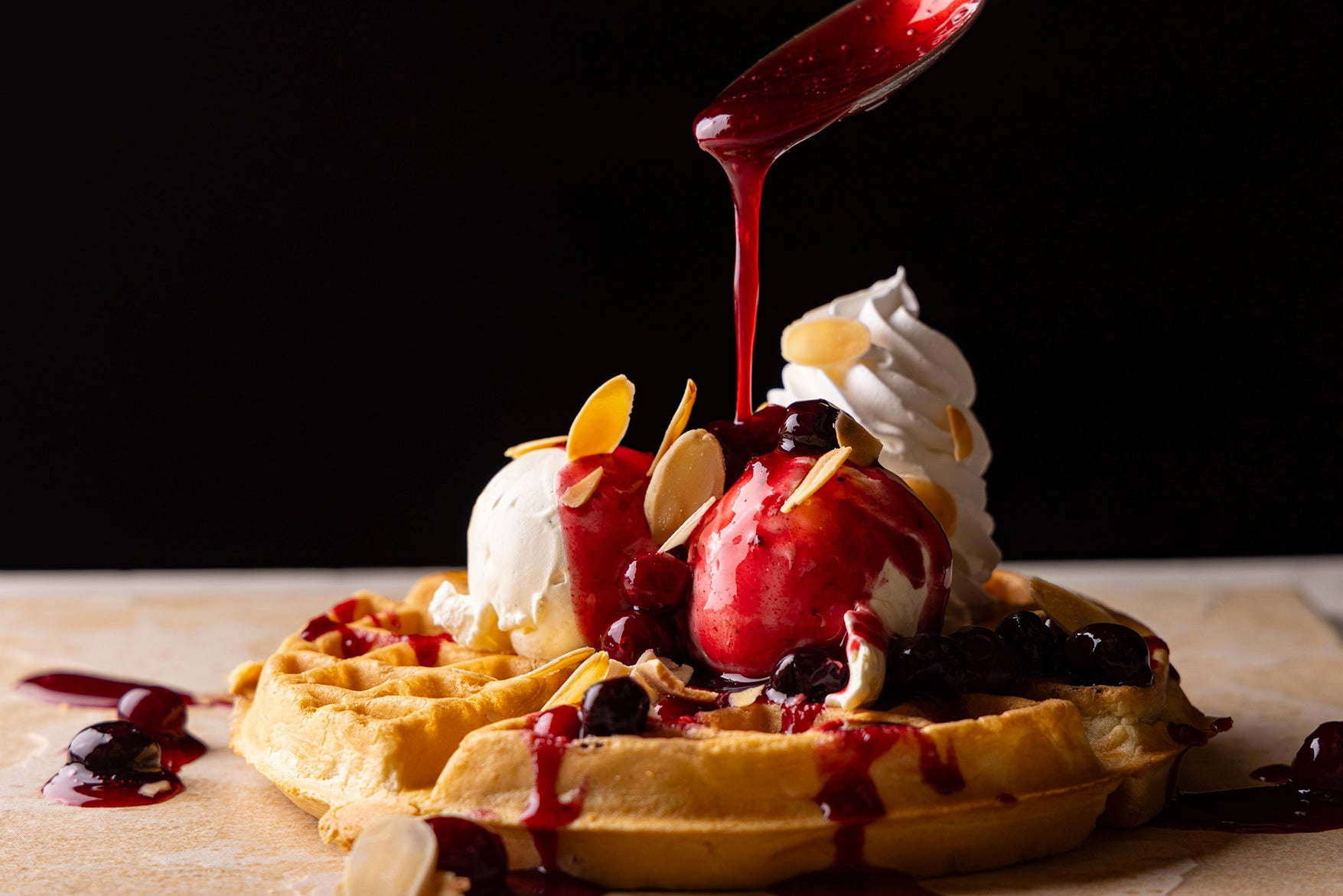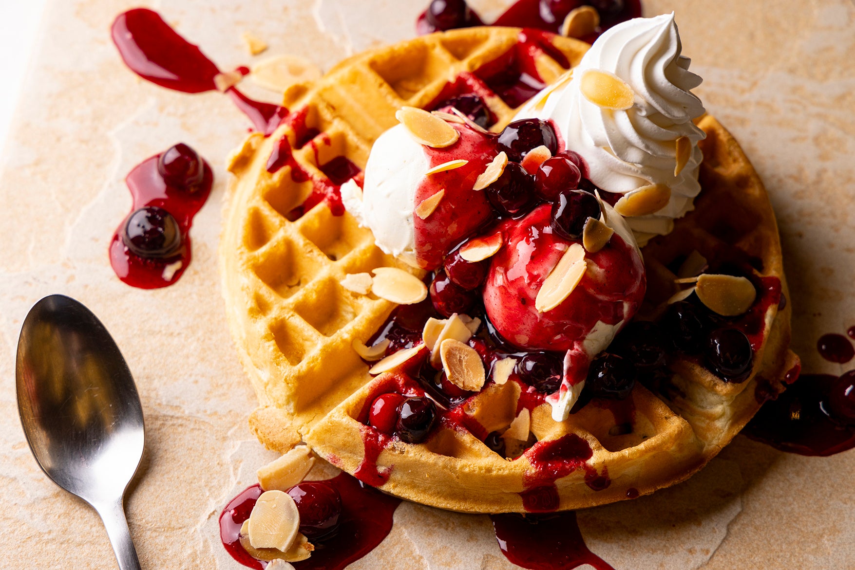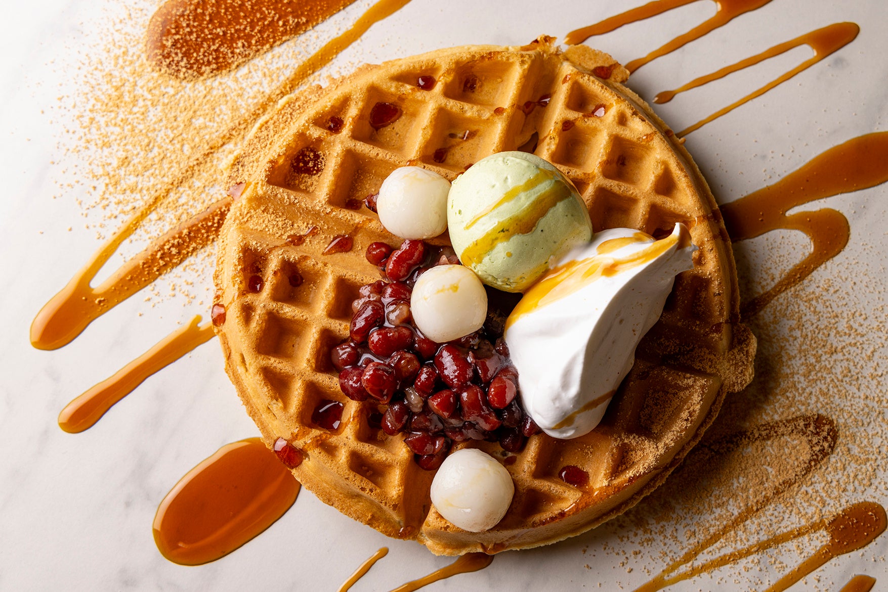 焼きたては外はカリッと中はふわふわ、少し時間を置くとふわふわ生地はそのままにもちもち食感になる、ほどよい甘みのアメリカンワッフルは、スイーツやセイボリーどちらとも相性が抜群で、そのサクふわっとしたテクスチャーがワッフルのバリエーションを変幻自在にしています。バニラアイスにたっぷりのホイップクリームと甘酸っぱいベリーソースやアーモンドスライスで華やかに仕上げたり、ホイップクリームとオレンジにチョコレートソース、チョコレートチップを合わせた甘さの中にも柑橘のさっぱりさを感じるコンビネーションを楽しんだり、白玉あずきときな粉に黒蜜をとろりとかけて和風に仕上げるアレンジもおすすめです。