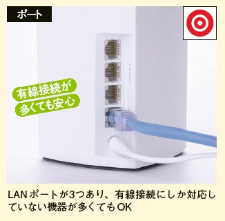 メッシュWi-Fiでベストバイに輝いたのは、「リンクシス」ブランドで展開されている「AtlasPro」。角柱の形状と白基調のデザインが特徴的な製品です。本機は親機の通信速度こそ2位の「Deco X90」に譲りましたが、サテライトの通信速度が速く、総合的に速度を評価した結果ベストになりました。ただし、本機のWANポートは1Gbpsまでの対応なので、それよりも高速なネット環境ではその速度を十分に引き出せません。本機はLANポートが3つ付いており、この種の製品としては豊富といえます。有線でしか接続できない機器が多い場合も安心して利用することができます。なお、今回は台組の製品で検証を行いましたが、他に3台組や単体での製品販売もされているため、使用場所の広さ、機器台数に応じてサテライトの数を増やすことができます。状況に応じた拡張が可能な点もメッシュWi-Fiルーターの利点といえます。