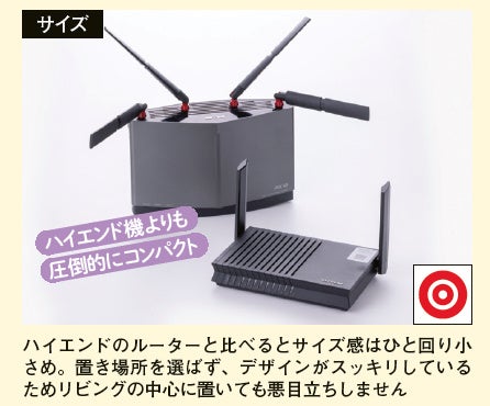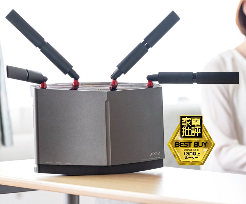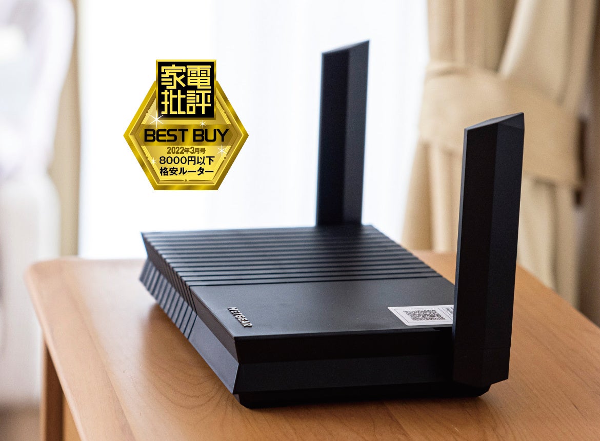 8000円以下という条件にもかかわらず、ネットギアの「RAX20-100JPS」は、最新の高速規格であるWi-Fi 6に対応。サブスク動画も途切れず楽しめる通信速度を記録しました。検証では2階建ての戸建て全体をカバーし、特にルーターを設置した1階では、一部のハイエンド機に迫る平均速度。専用アプリが用意されており、初期設定および管理がスムーズに行えるため、Wi-Fi初心者でも扱いやすいことも高評価です。コンパクトなサイズまで含め、総合力でベストバイに決定しました。