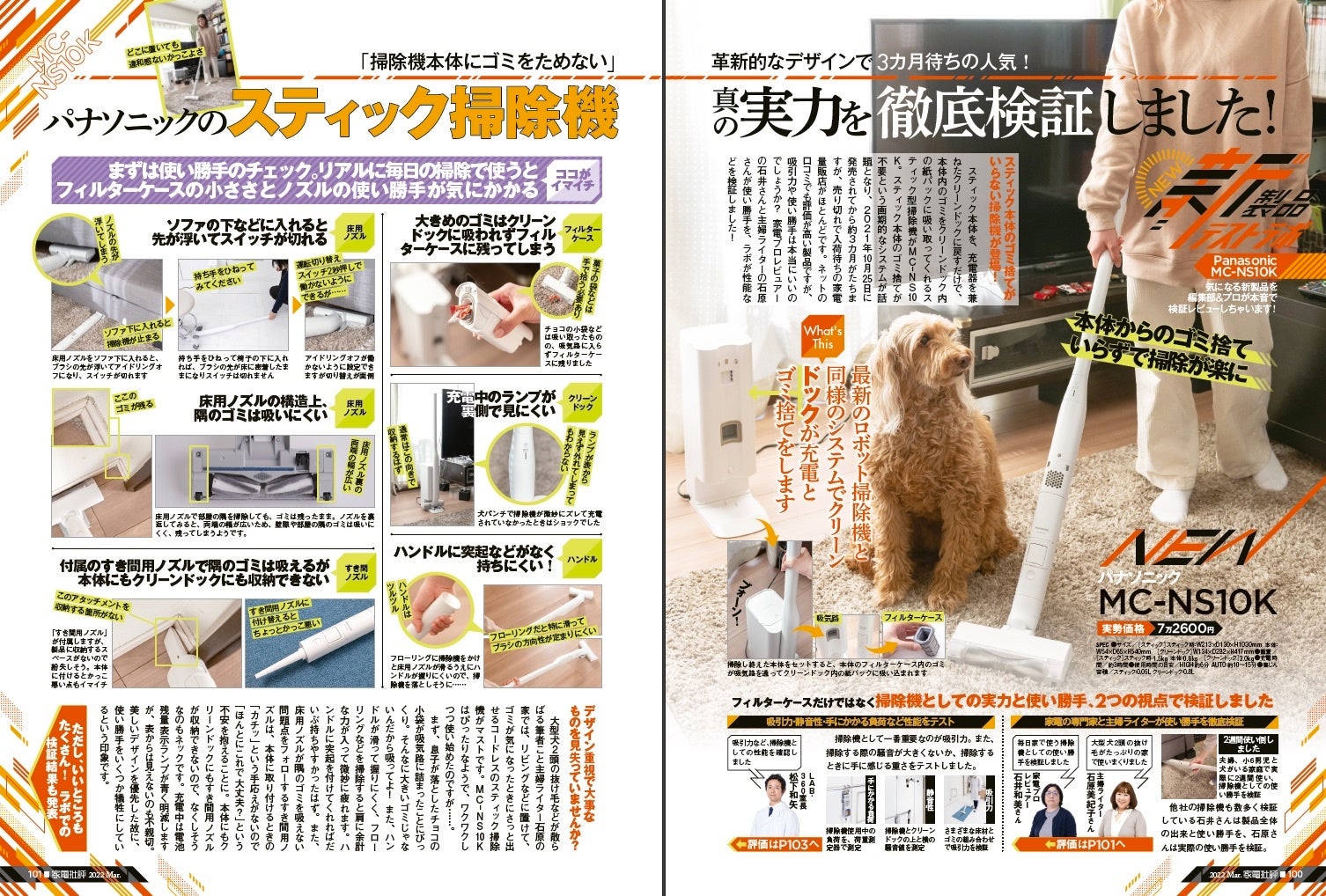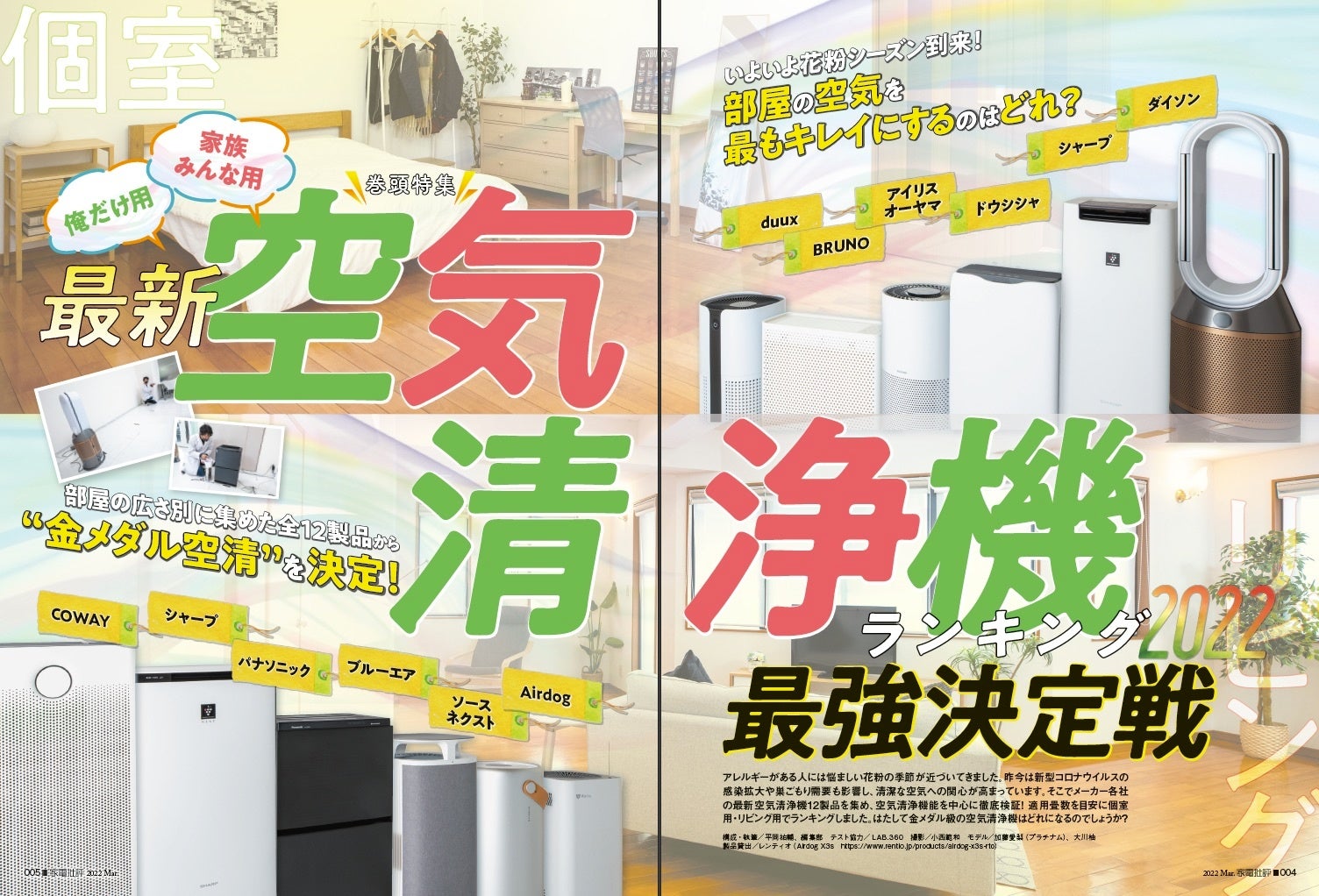 3月号では、部屋の広さ別に集めた全12製品の中から、“金メダル空気清浄機”を発表。部屋の空気を最もキレイにする最強の1台を見つけました! さらに「Wi-Fiルーターランキング」では、価格帯・用途別に高速かつ使い勝手の良いWI-Fiルーターのベストを決定! そのほかにも、性能と使い勝手を兼ね備えた「スティック掃除機」、イヤホン界の名機「シュア」の徹底検証など、暮らしを快適に変える家電情報満載でお届けしています。 本リリースでは、商品テストに基づく編集部おすすめのベストバイ製品の一部をご紹介します。