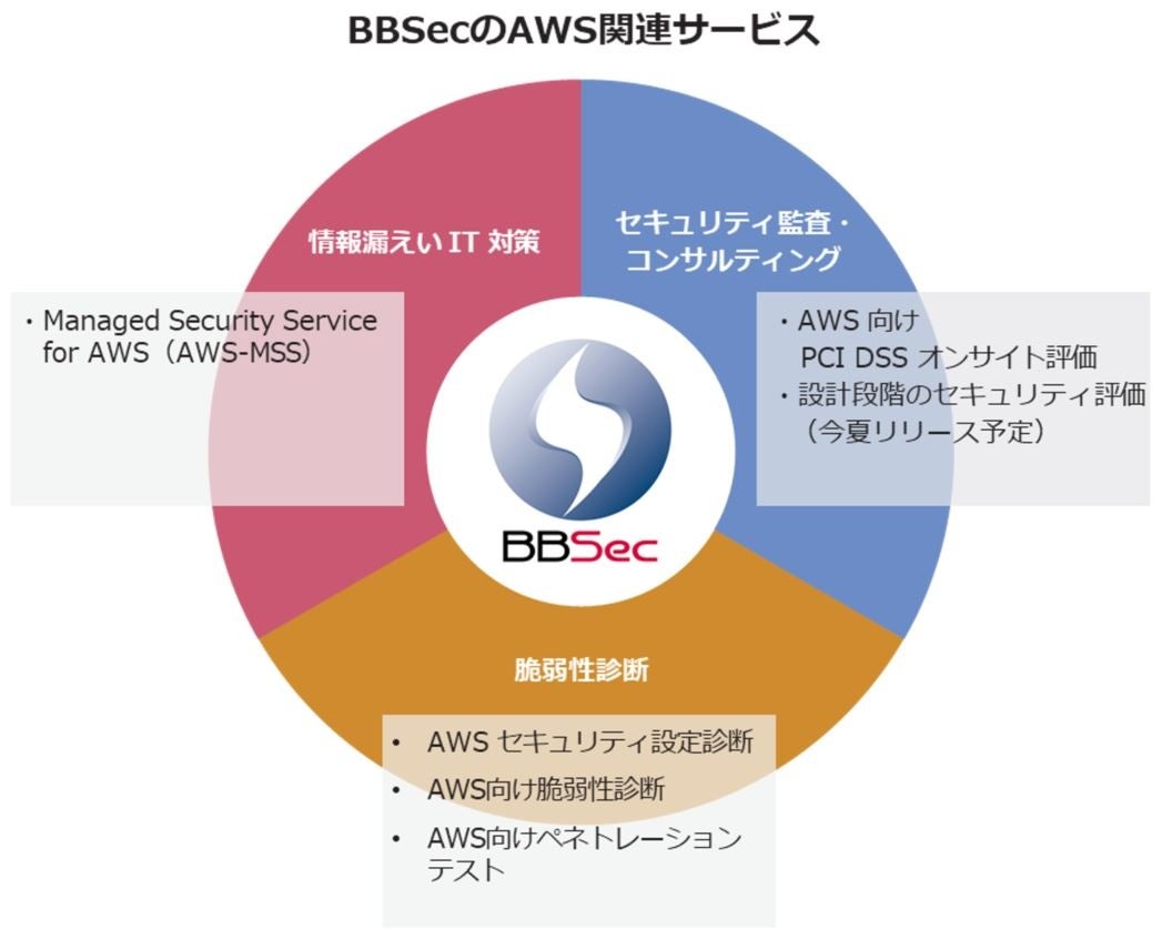 現在、BBSecではAWS関連サービスとして「AWS向けPCI DSSオンサイト評価」をはじめとするコンサルティングサービスやAWS設定診断の他、ベストプラクティスに基づく適切な設定が正しくなされているか、侵入の予兆は無いかなどをリアルタイムでモニタリング及び対応するマネージドサービス「Managed Security Service for AWS」を展開しております。