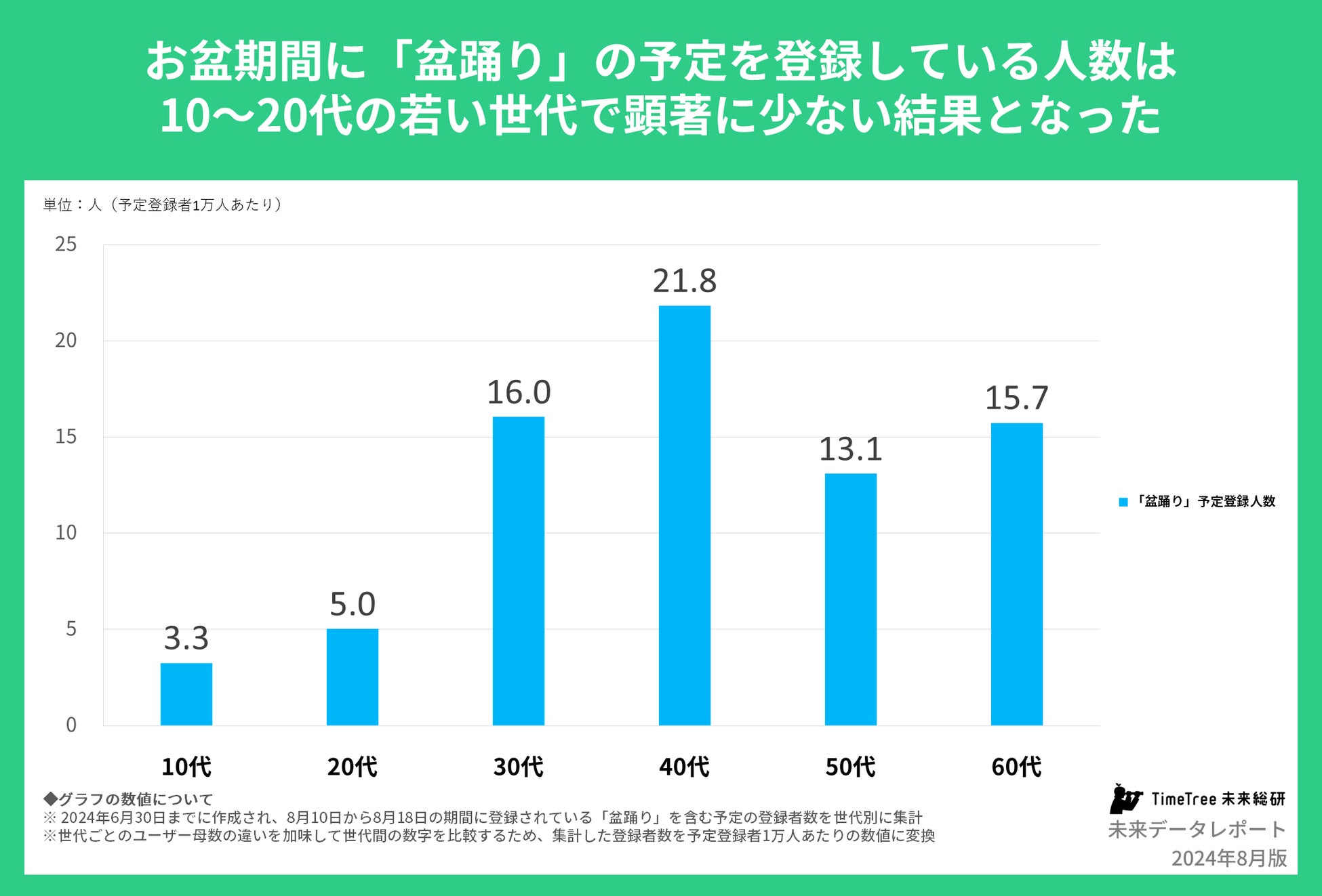 さらに、お盆に関連した予定として「盆踊り」の予定についても見てみると、こちらも10~20代では「盆踊り」の予定を登録する人の割合が少ないことが顕著に見てとれました。