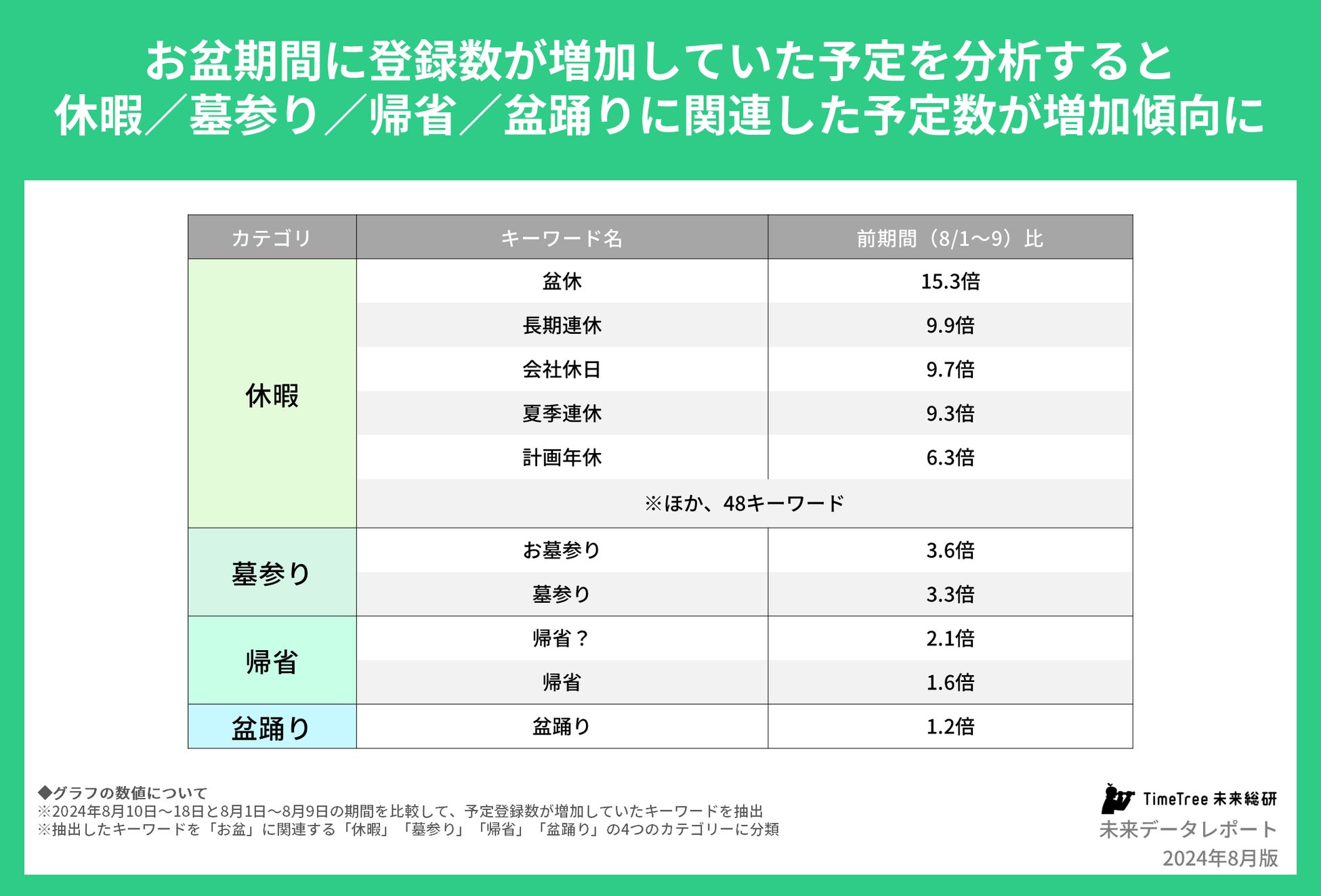株式会社TimeTree(本社:東京都新宿区、代表取締役社長:深川 泰斗)の社内研究所『TimeTree未来総合研究所』(https://timetreeapp.com/intl/ja/future-research-institute)は、TimeTreeユーザーの予定動向をまとめた「未来データレポート」の8月版を公開したことをお知らせいたします。