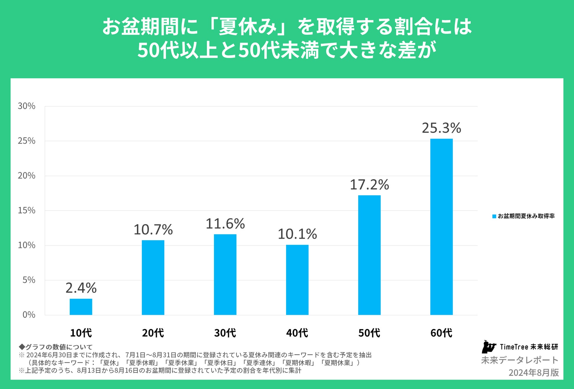 「休暇」関連では、特に「夏休み」の予定に注目し、お盆期間の8月13日から16日に「夏休」「夏季休暇」など夏休みに関連したキーワード7つの予定を登録している人の割合を世代別に見てみたところ、50代・60代ではお盆に合わせて夏休みをとる割合が顕著に高く、若い世代とのギャップが見てとれました。
