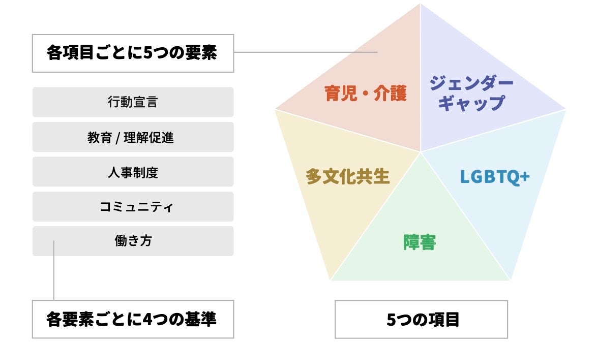「ダイバーシティスコア」とは、【ジェンダーギャップ】【LGBTQ+】【障害】【多文化共生】【育児・介護】の5つの観点で構成された100項目です。D&Iの重要性・理念の理解や社内啓発だけでなく、具体的な施策も盛り込んでいます。