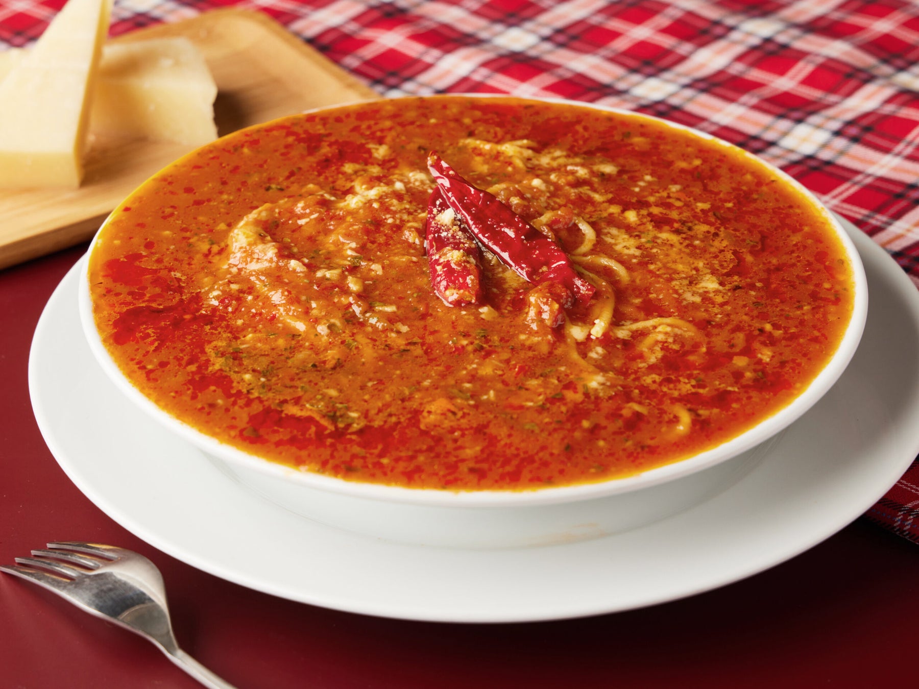 たっぷりのニンニクをソテーして旨味を引き出し、ピリッと唐辛子が刺激的なトマト―スープスパゲッティ。
