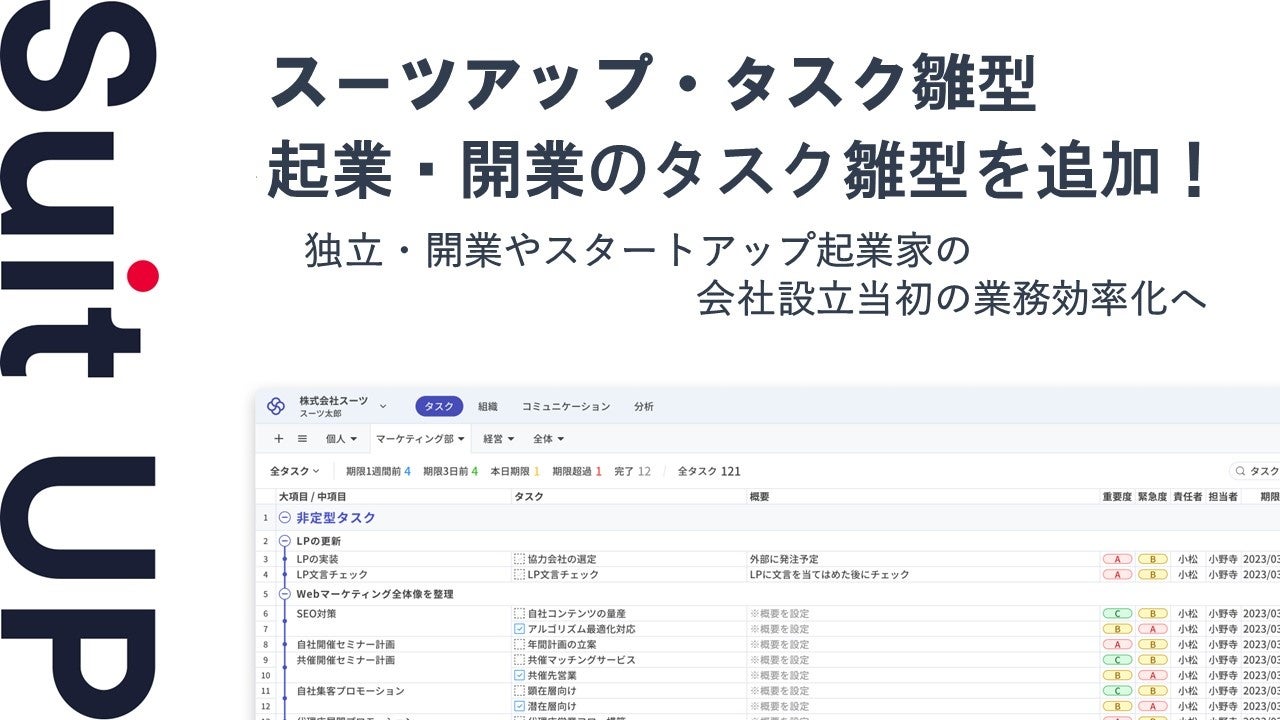株式会社スーツ(所在地:東京都千代田区、代表取締役社長CEO:小松 裕介)は、チームでかんたん、毎日続けられるプロジェクト・タスク管理ツールの経営支援クラウド「Suit UP」(スーツアップ)に起業・開業のタスク雛型を追加したことをお知らせします。
