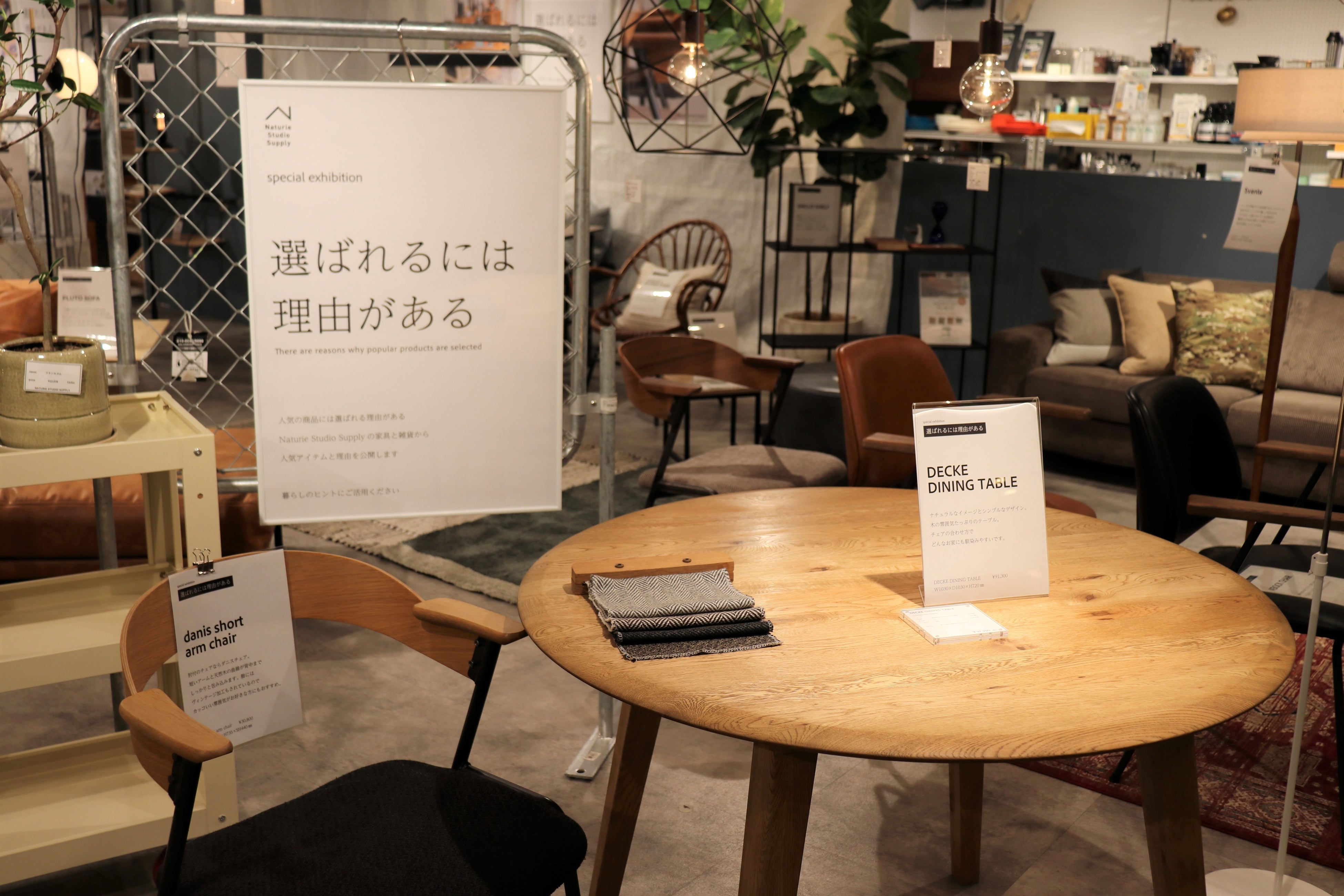 店内中央に特設コーナーを設置し、商品POPと共に選ばれる理由を記載。家具から雑貨まで楽しめるレイアウトになっています。