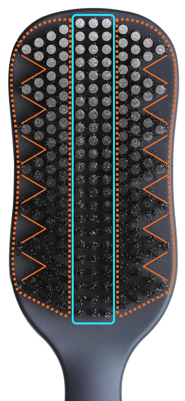 通常のブラシのような密な植毛だと絡まってしまう毛のもつれも、するすると解いてストレートに。