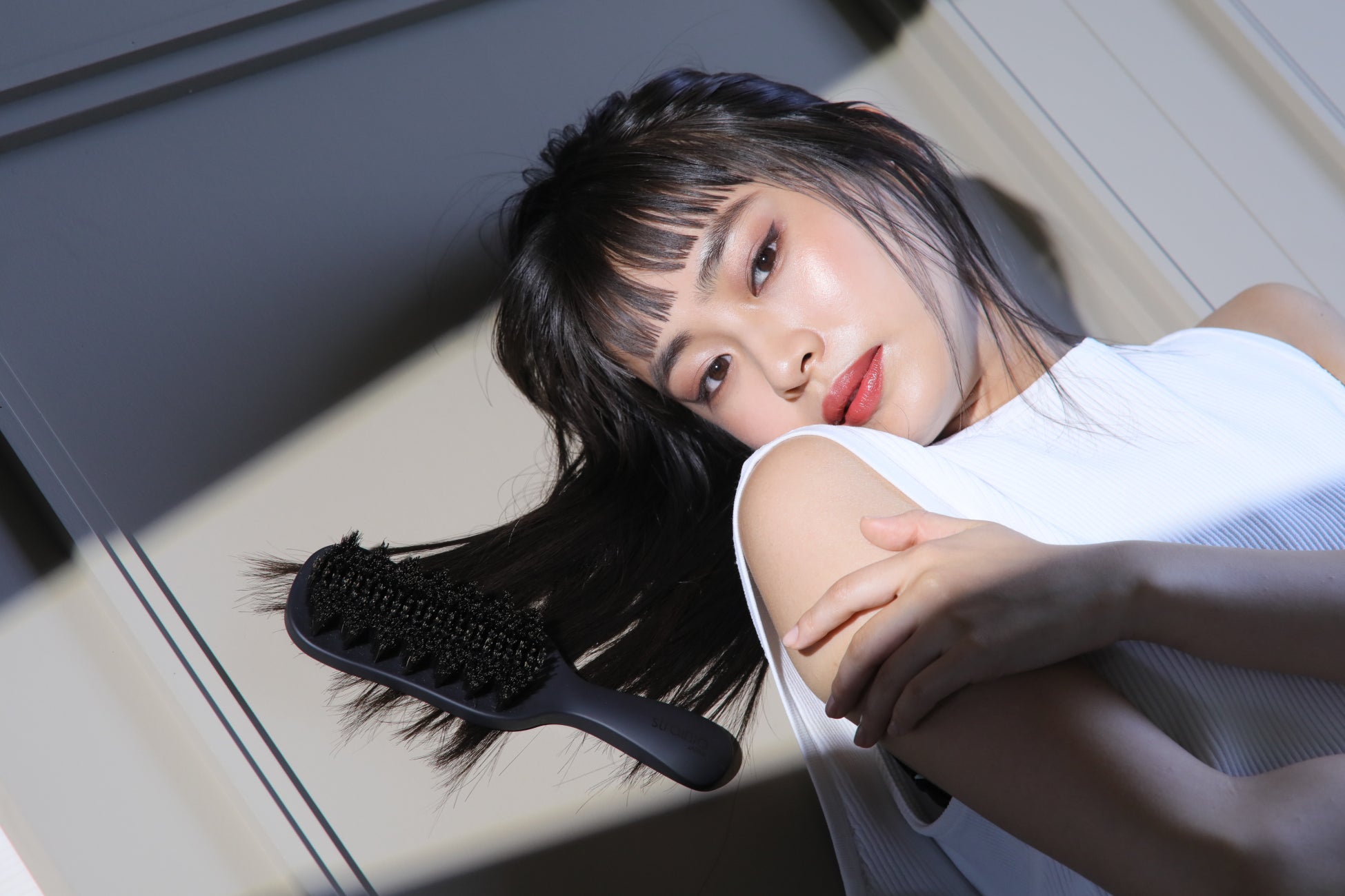 広い空間に表現されたうねりの形状と石を避ける曲線、その合間に見える直線の流れから髪の流れを想起しました。広い空間から毛束を入れ、その後に整然と揃った空間を通して出す。ここから独自の植毛パターンのアイデアが浮かびました。このようにして枯山水から着想を得た「ケアストレートブラシ」が誕生しました。
