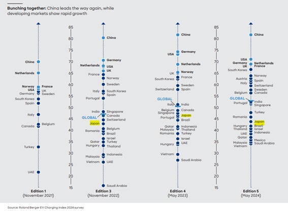 欧州系最大級のグローバル戦略コンサルティングファームであるローランド・ベルガー(本社:ドイツ、ミュンヘン)は、本日、世界の電気自動車(EV)普及動向を示す指標を調査した最新レポート「EV充電指数第5版:市場成長は鈍化、焦点は充電インフラ」を発表しました。日本のスコアは44となり、2年連続で順位を下げしました。