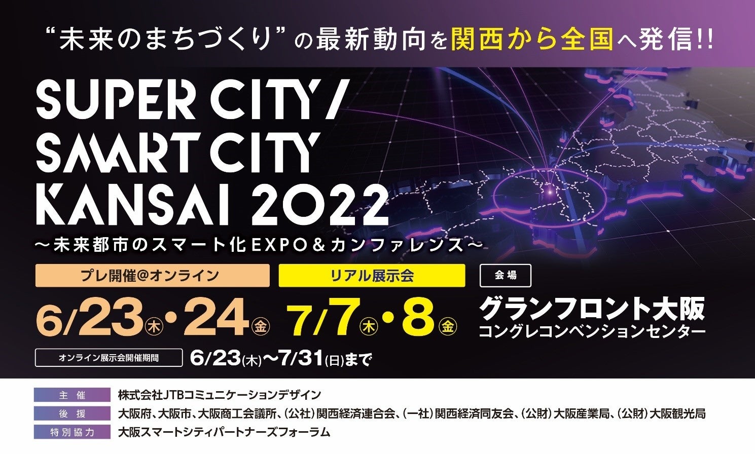 JTB グループで様々なコミュニケーションサービスを提供する、株式会社JTB コミュニケーションデザイン(東京都港区、代表取締役 社長執行役員:古野 浩樹、以下JCD)は、「Super City / Smart City KANSAI 2022(https://www.supercitysmartcity.com/)」を、6月23日(木)~24日(金)にオンラインのプレイベントを実施し、7月7日(木)~8日(金)にグランフロント大阪 コングレコンベンションセンターにてリアル展示会を開催いたします。