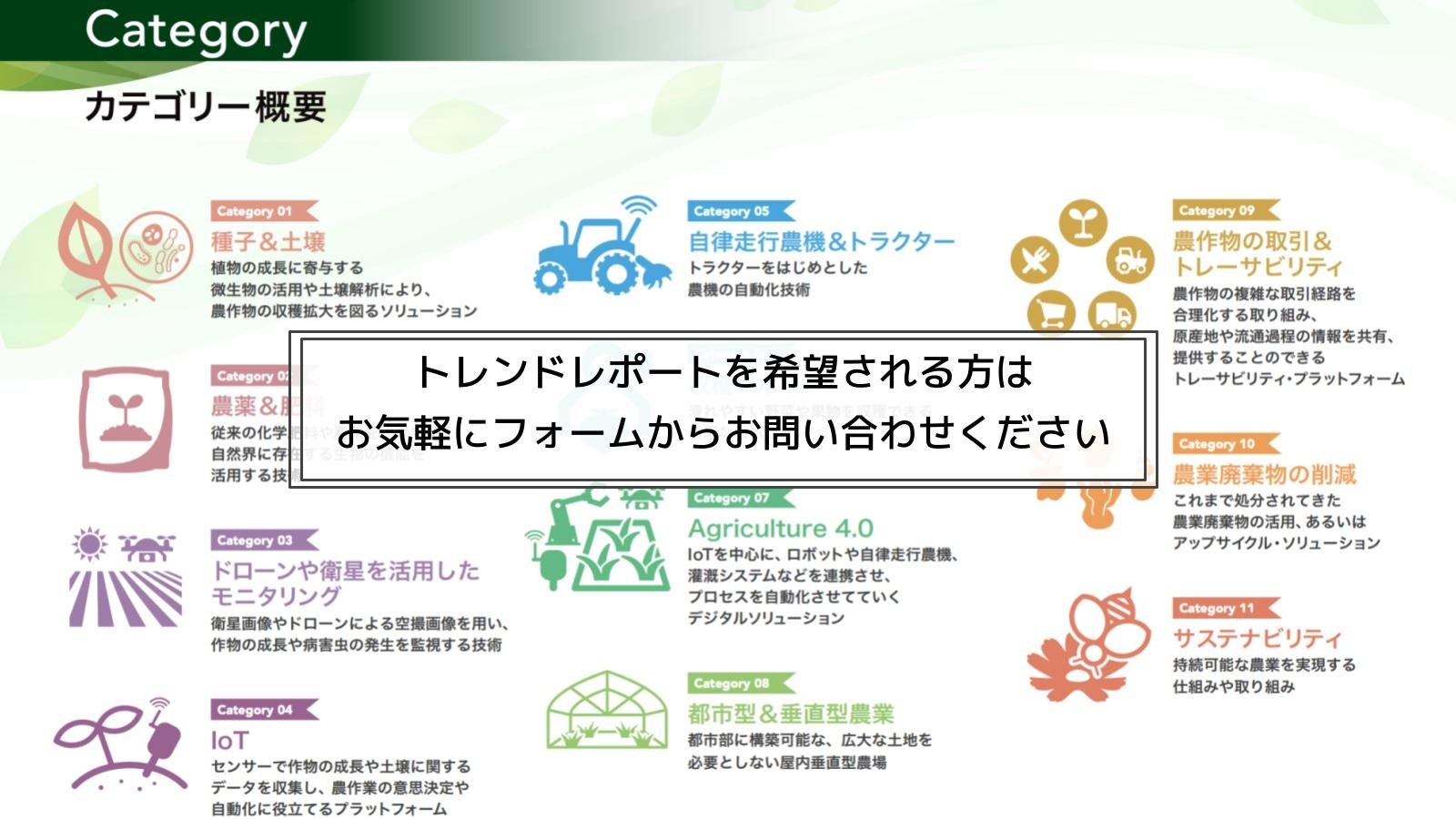 農薬&肥料、収穫ロボット、都市型&垂直型農業、農業廃棄物の削減などのテックトレンドを一括把握