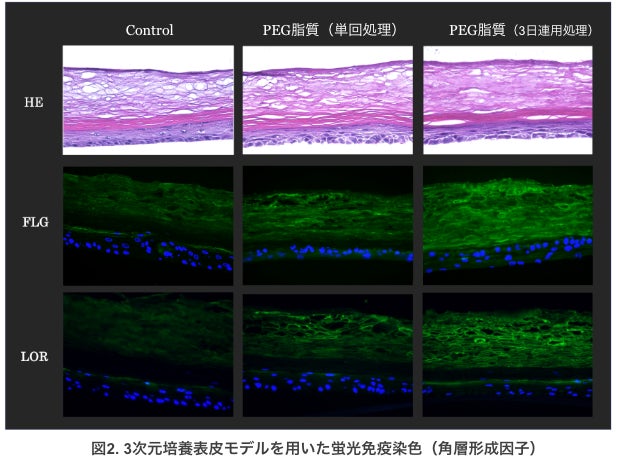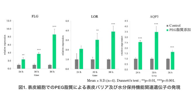 これらの結果から、PEG脂質はNrf2経路の活性化を通じて角層形成および保湿に関わる因子の発現を促進し、皮膚のバリア機能および水分保持機能の改善に寄与する可能性が示されました。