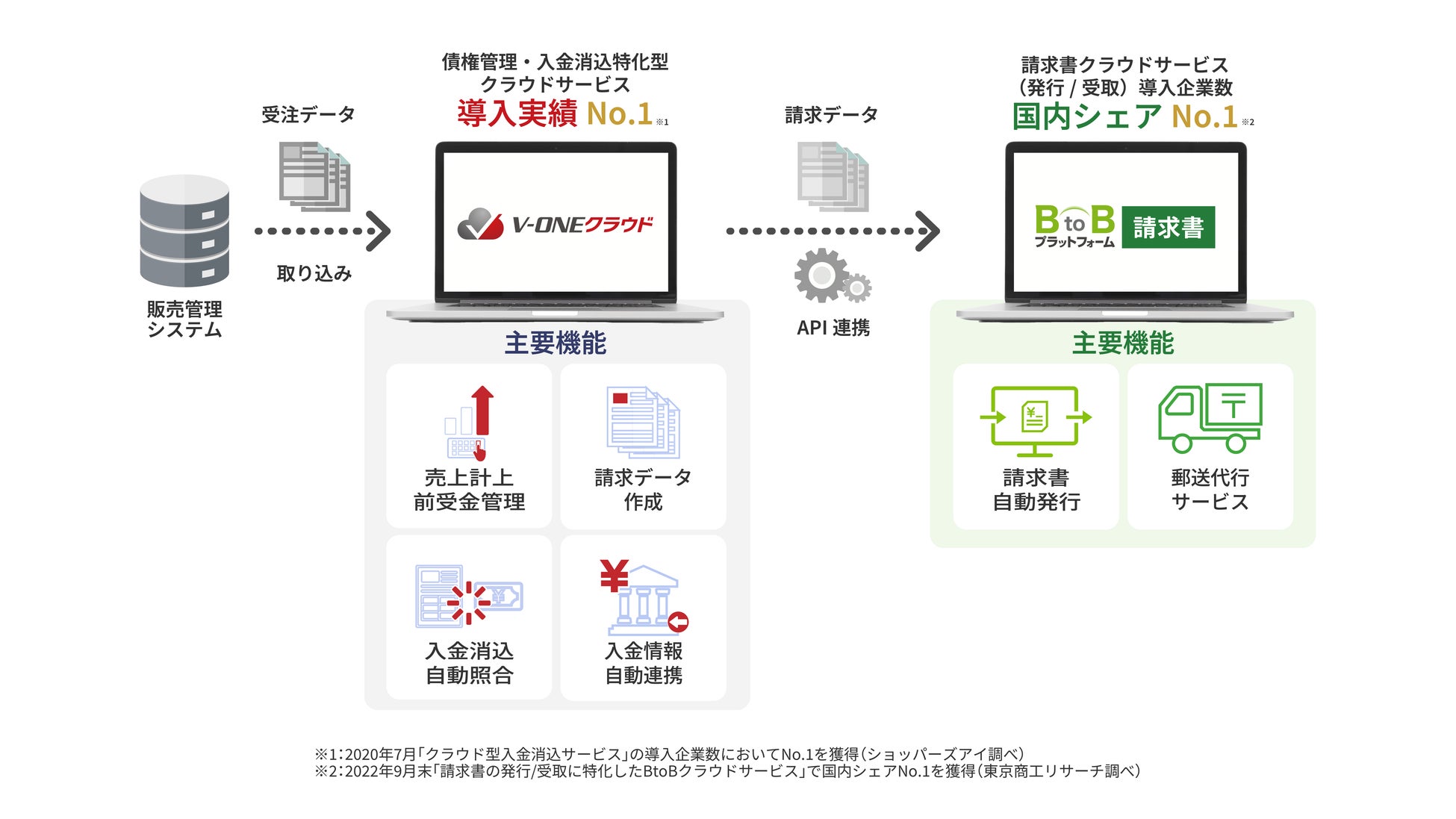 「V-ONEクラウド」は、売上を計上した請求データを「BtoBプラットフォーム 請求書」へAPIによりデータ連携することが可能となりました。これにより売上計上から、請求書作成、請求書発行、入金消込から滞留債権管理までを2つのシステムを活用し、シームレスに自動化することが可能になります。