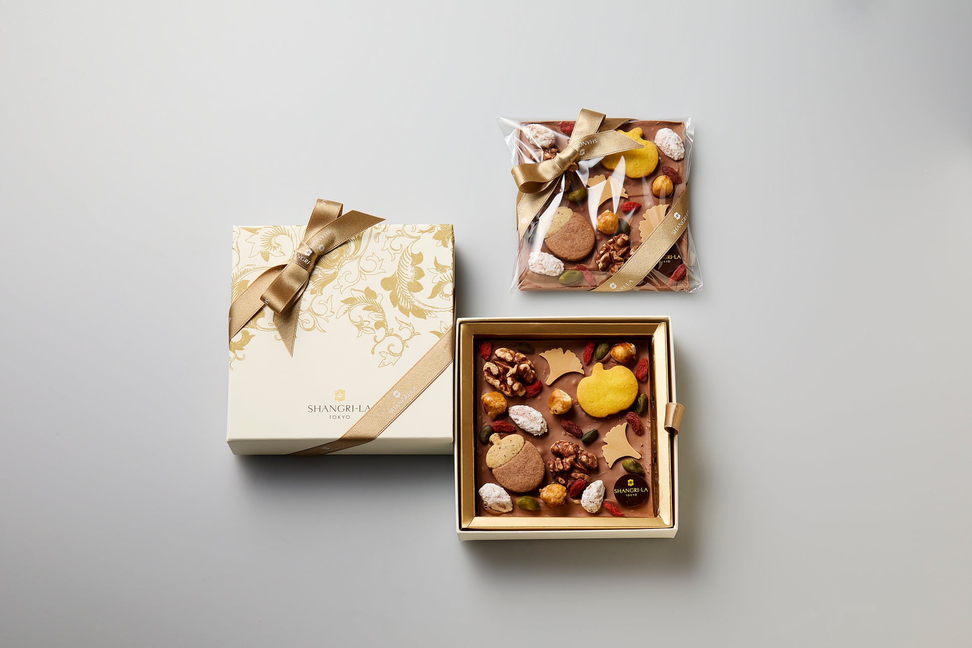 毎年ご好評いただいている秋限定の「オータムチョコレートバー」が、今年も新たな装いで登場します。深みのある香ばしさとやわらかな甘みをまとったチョコレートに、アーモンド、クルミ、ヘーゼルナッツなど厳選したナッツとクコの実を贅沢にトッピング。ひと口含めば、上品な塩味が甘みを引き立て、ナッツの豊かな風味が口いっぱいに広がります。さらに、東京都のシンボルであるイチョウをかたどったチョコレートのデコレーションが、東京の美しい紅葉を優雅に表現。可愛らしいどんぐりやかぼちゃ型のクッキーも添えられ、どこから味わうか迷う楽しさも魅力です。お子様のおやつとしてはもちろん、ワインなどのお酒とともに楽しむ大人の贅沢なひとときにもぴったりです。