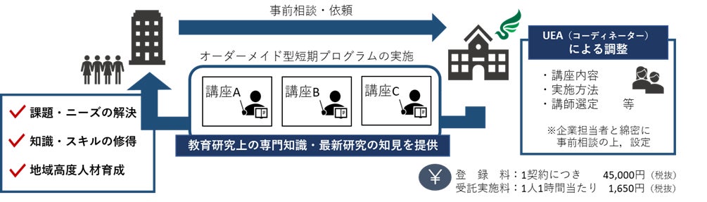 「人生100年時代」を迎え、急速かつ広範な社会環境の変化に対応するため、個人のみならず、企業等からも、学び/学び直しを促進するための教育訓練機会の確保・強化の要望が高まっています。企業ごとに異なる課題やニーズに対応するためには、本学既存の社会人向け教育プログラムの他に、よりきめ細やかなカリキュラムのカスタマイズが可能な教育プログラムの設置が必要となります。