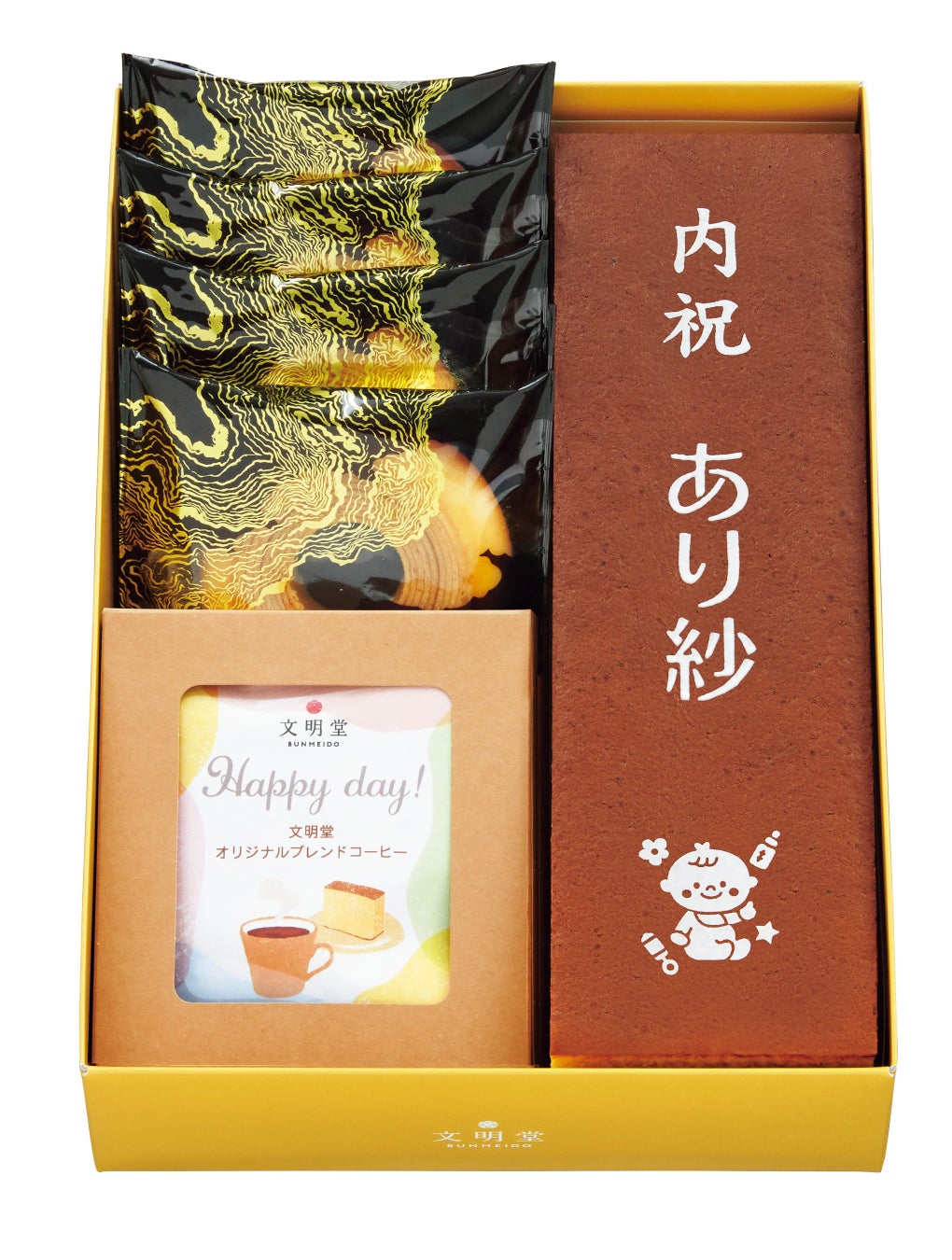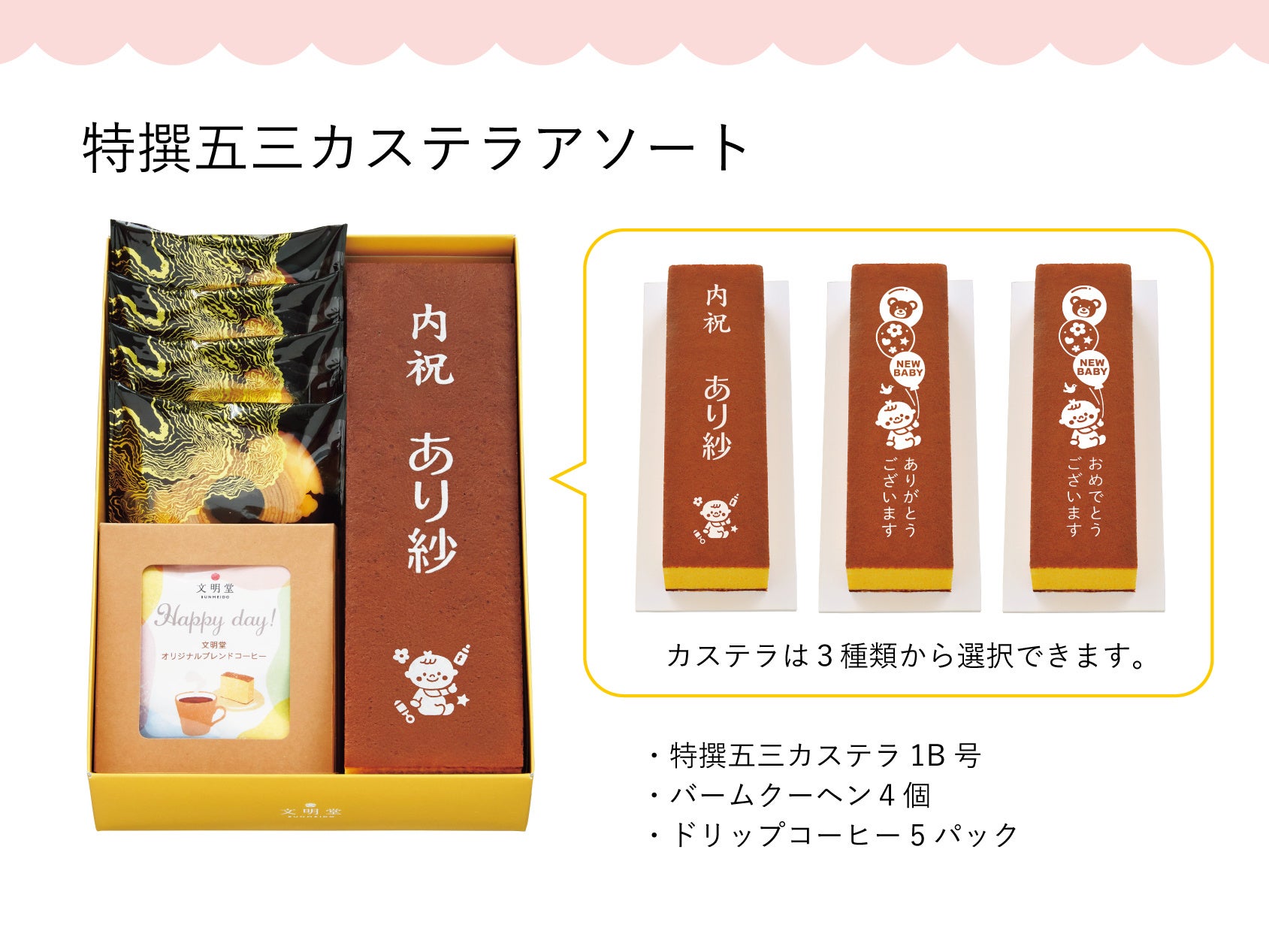 商品内容:特撰五三カステラ×1本、バームクーヘン×4個、文明堂オリジナルブレンドコーヒー×5パック