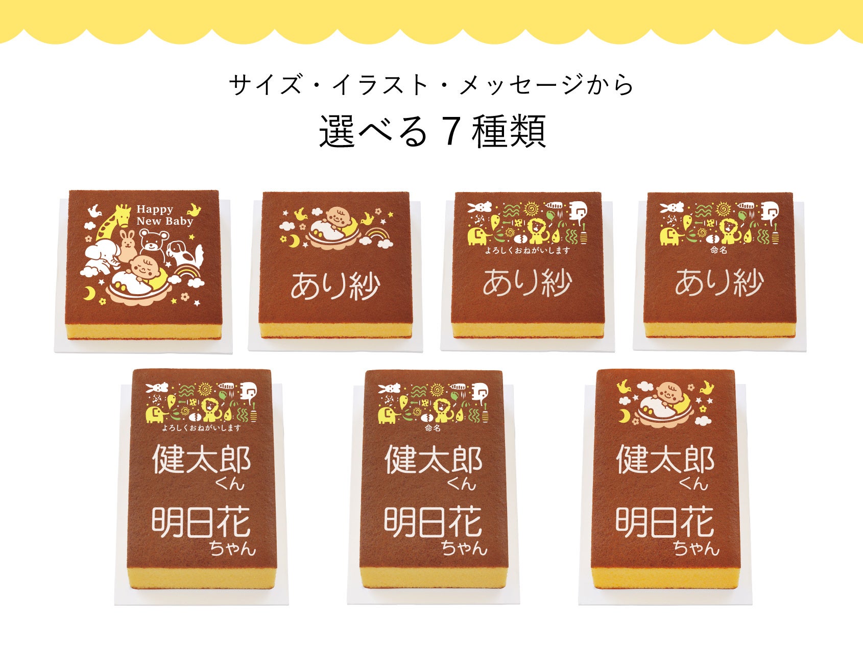 1,000円~ 看板商品のカステラに、かわいいイラストや赤ちゃんのお名前を。