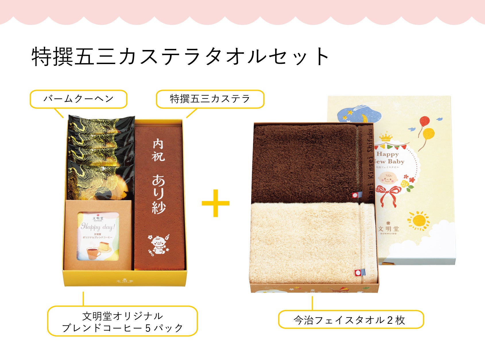 商品内容:特撰五三カステラ×1本、バームクーヘン×4個、文明堂オリジナルブレンドコーヒー×5パック、今治フェイスタオル2枚セット