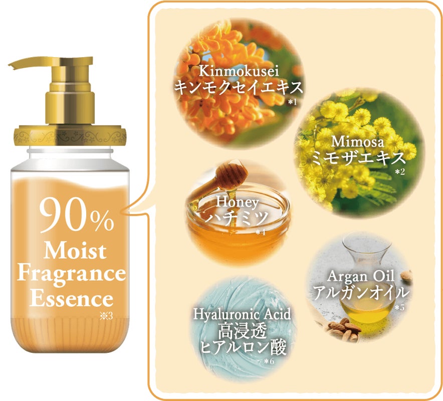 *1モクセイ花エキス(香気・保湿)(シャンプーのみ) *2ミモザアカシア花エキス(香気・保湿)(ヘアトリートメントのみ)