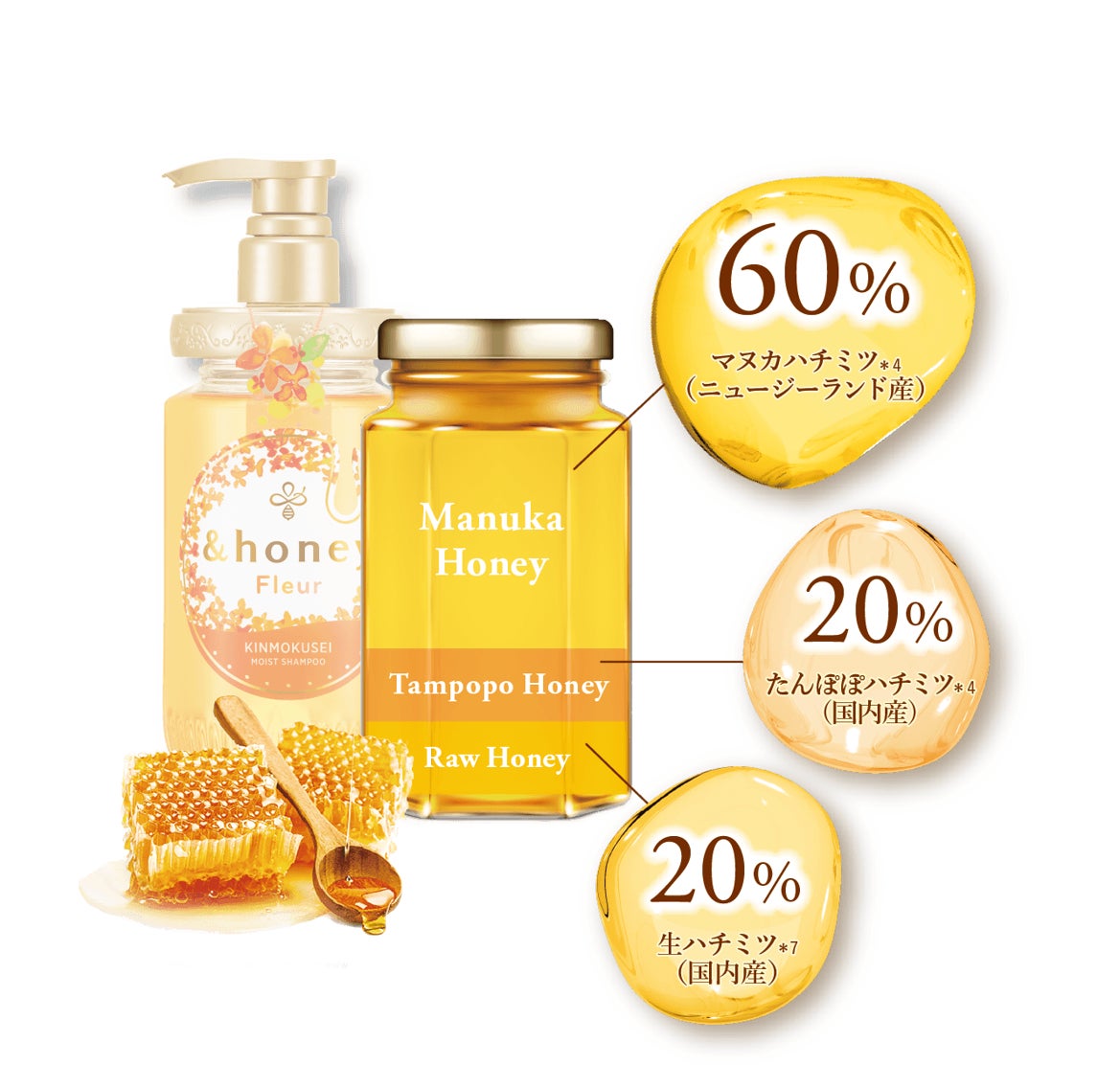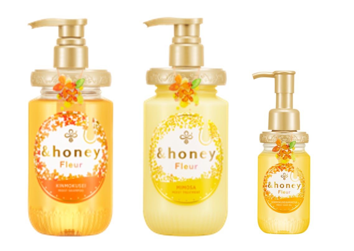 &honey Fleurは厳選した香り高い金木犀*1とミモザ*2を採用し、&honey史上最も香る※1、甘く上品なフレグランスで髪も心もリラックス※2するアイテム。また製品の90%以上が保湿&香気成分※3で構成され地肌から毛先まで香りで包み込み、うるおう髪へ導きます。