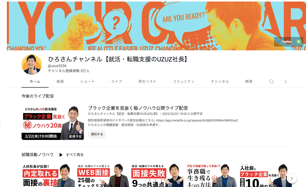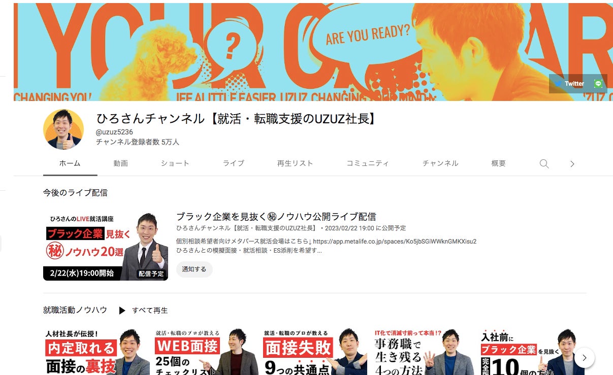「ひろさんチャンネル【就活・転職支援のUZUZ社長】」は、設立10年で2万人以上の就活・転職支援で培ったノウハウをより多くの方に届けるべく、当社代表岡本が2018年に開設したYouTubeチャンネルです。