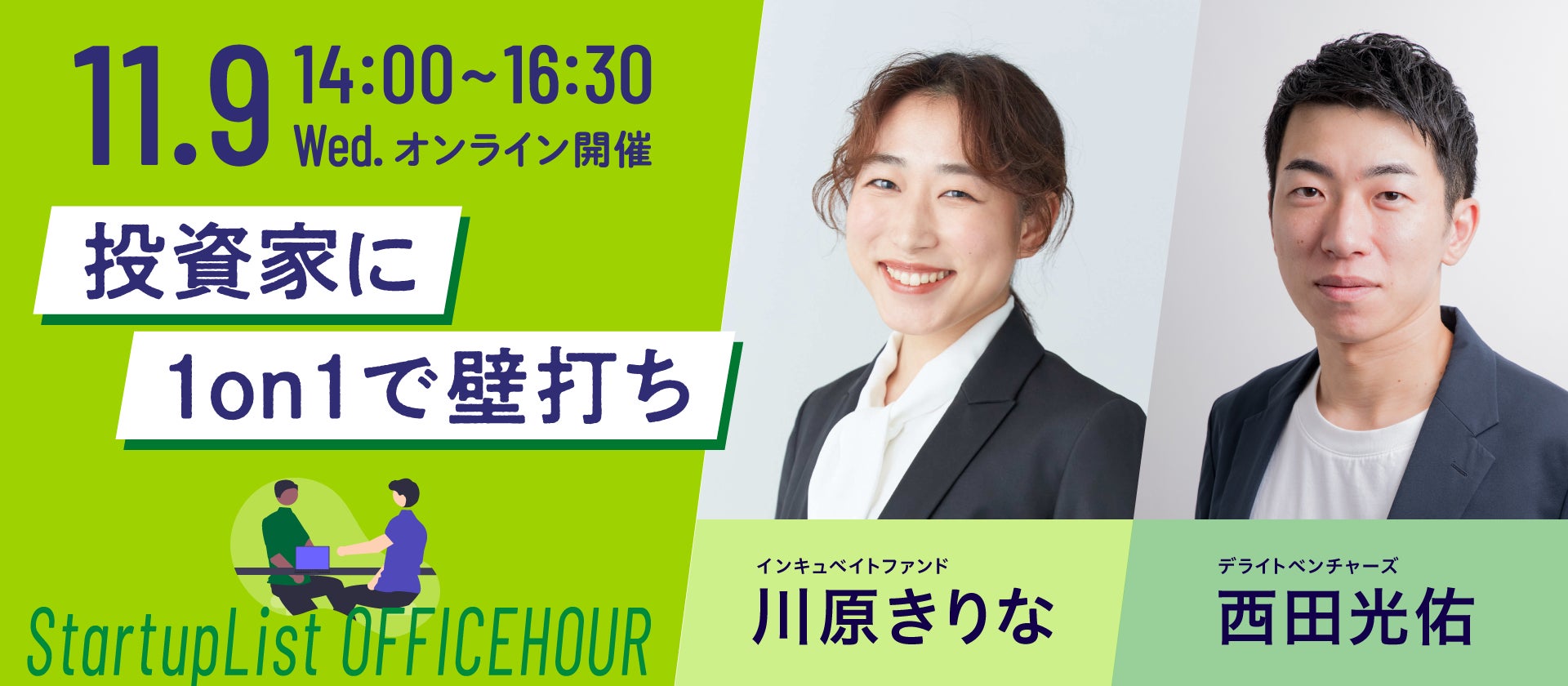 【限定8社 資金調達第一歩!】投資家にマンツーマンで気軽に壁打ちができるイベント「第4回 StartupList オフィスアワー」を11月9日(水)&11/16(水)オンラインにて開催