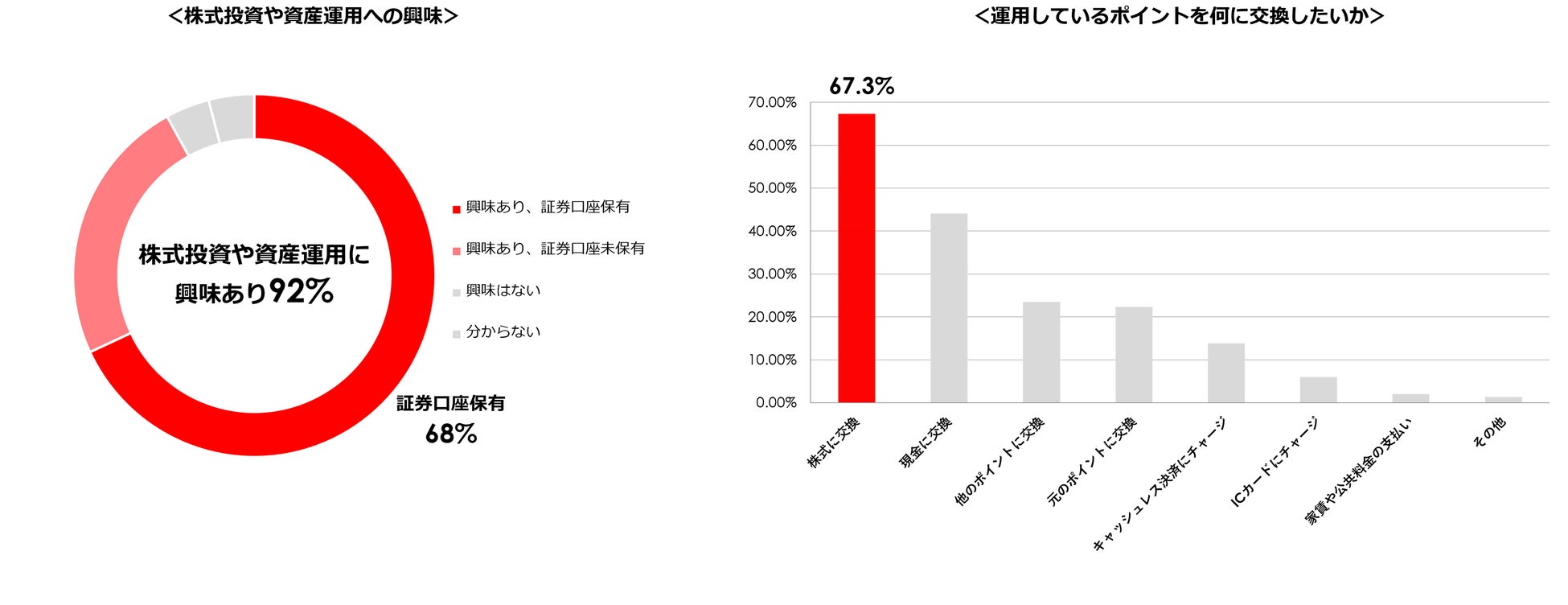 当社が行ったStocKPoint会員アンケートによると、回答してくれた1万人超の会員の内、92%が「株式投資や資産運用に興味あり」と回答しており、その内の68%が「証券口座を保有していると」と回答。また、67%が運用したポイントを「株式に交換したい」と回答しています。